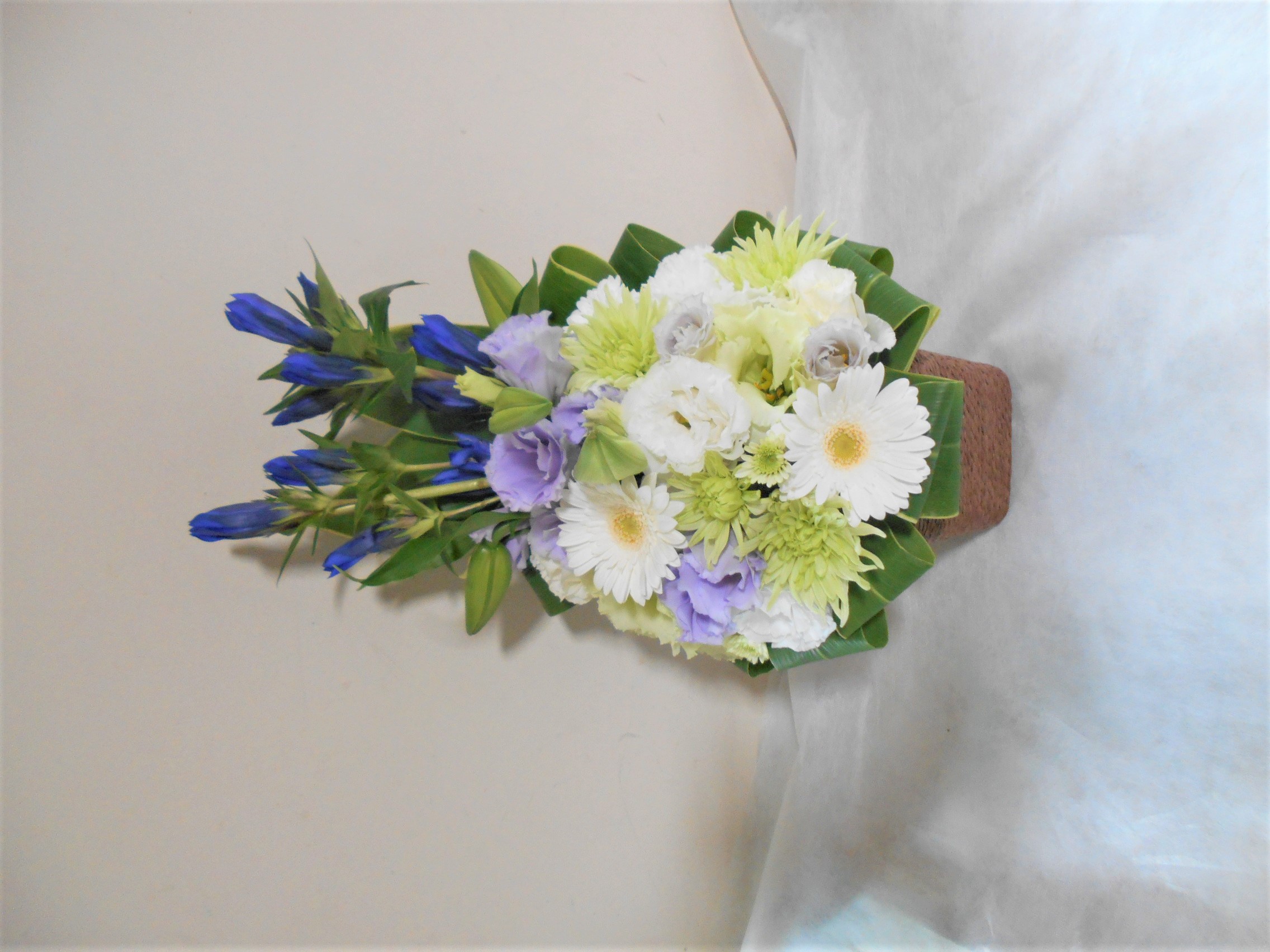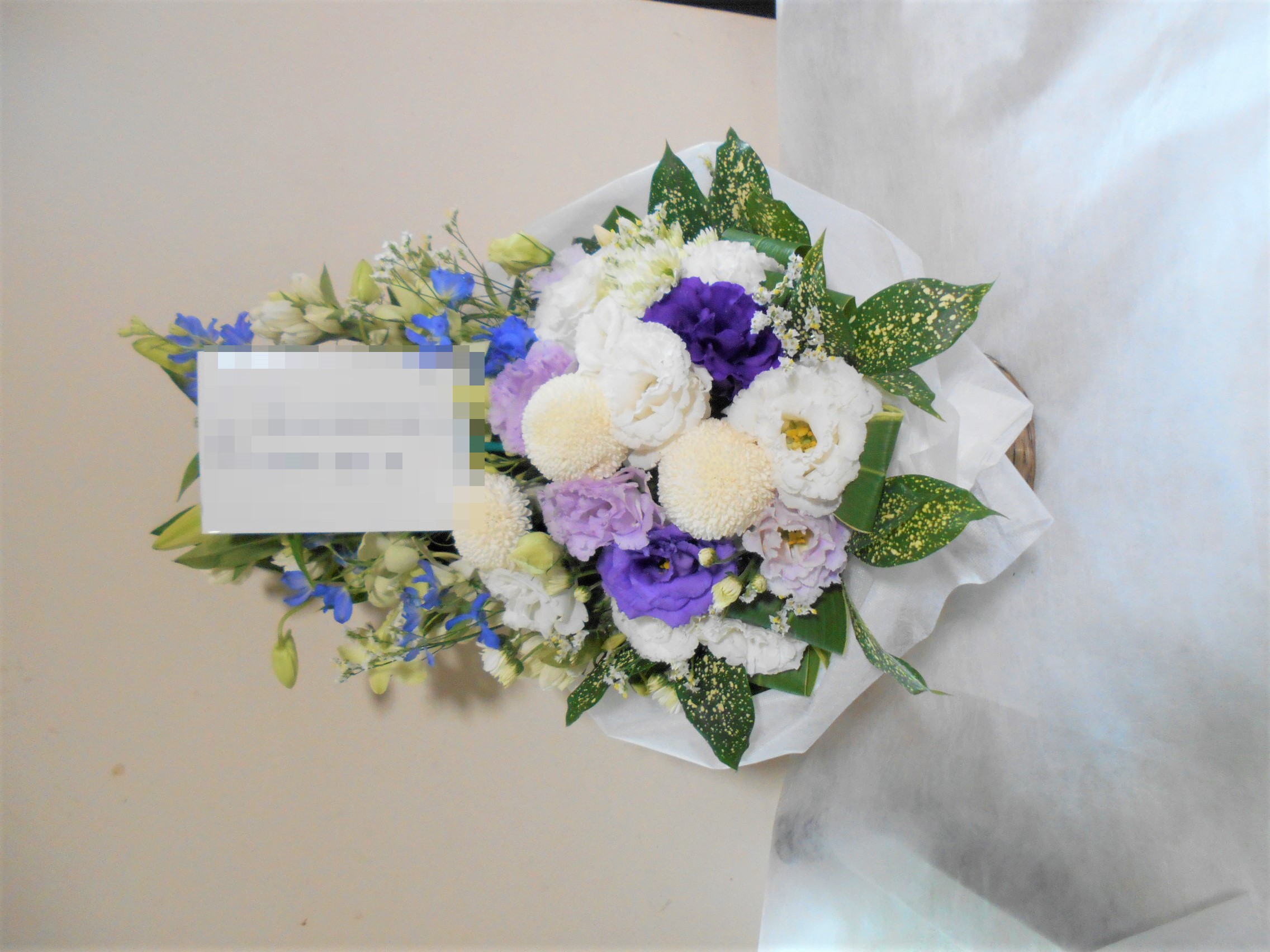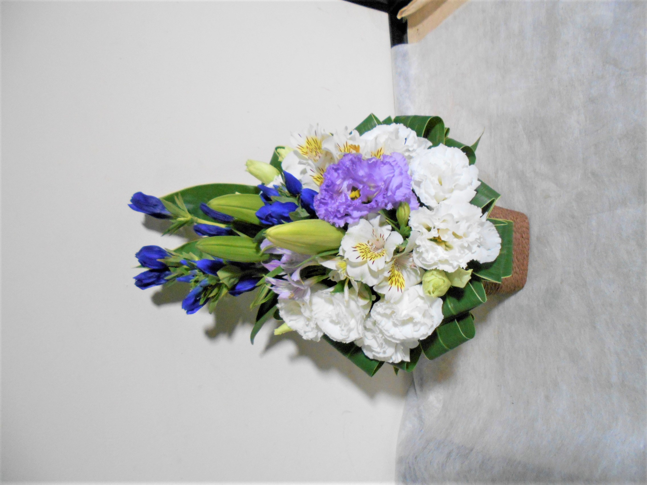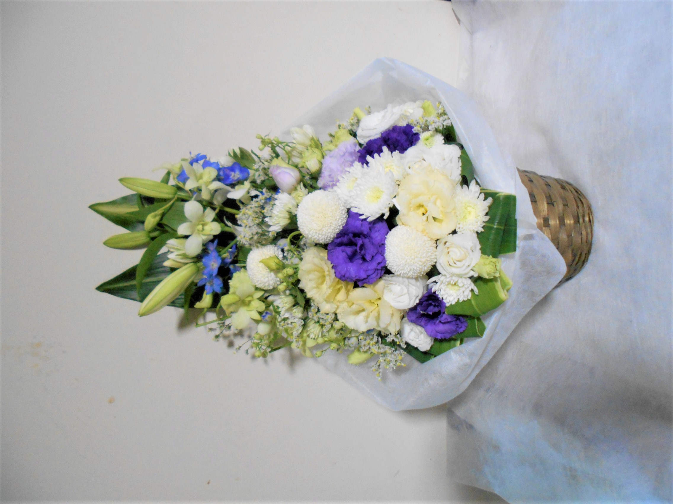 お悔やみ お供えの花 供花 (ホワイト&青・紫系カラーのお花でまとめたバスケットアレンジ)
