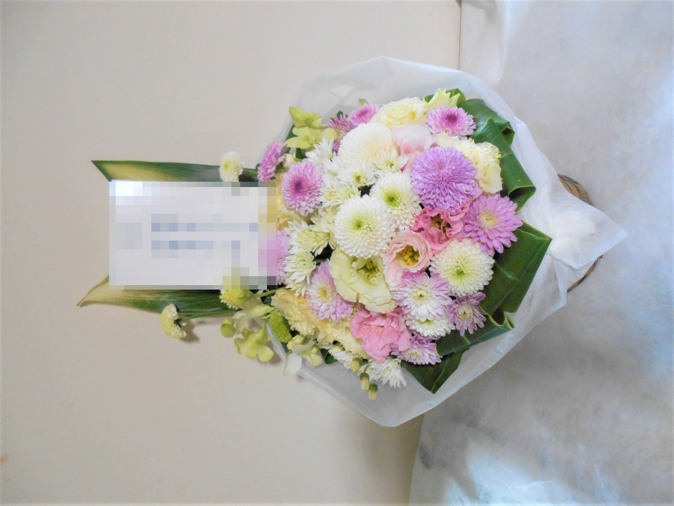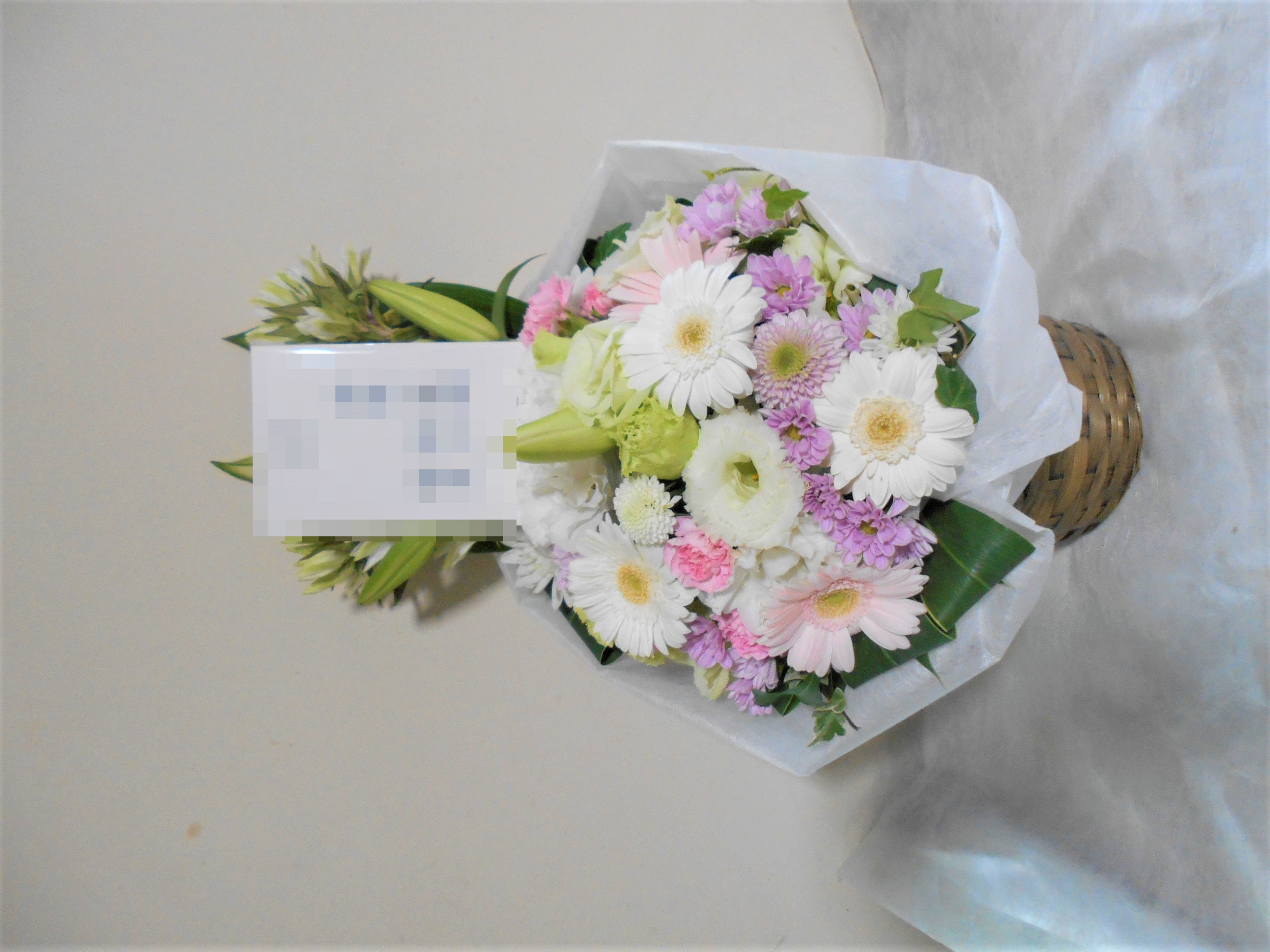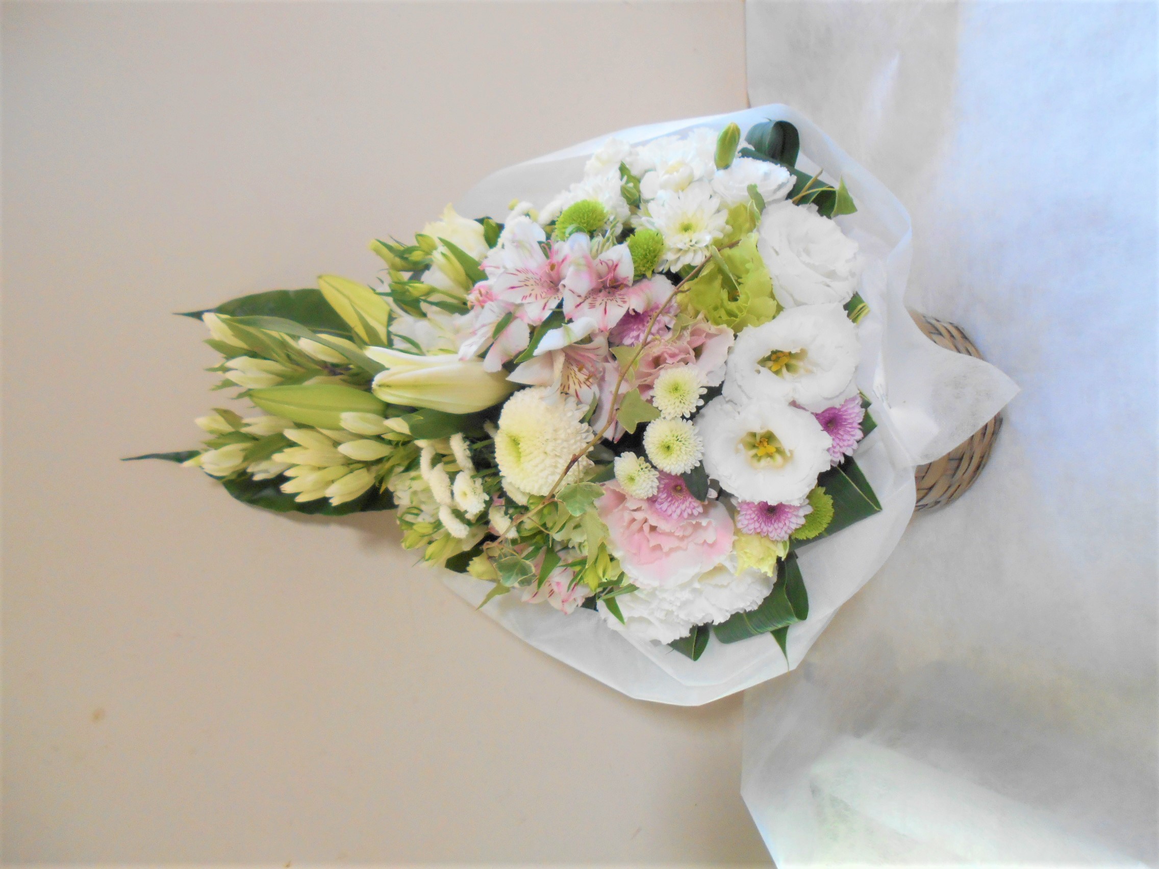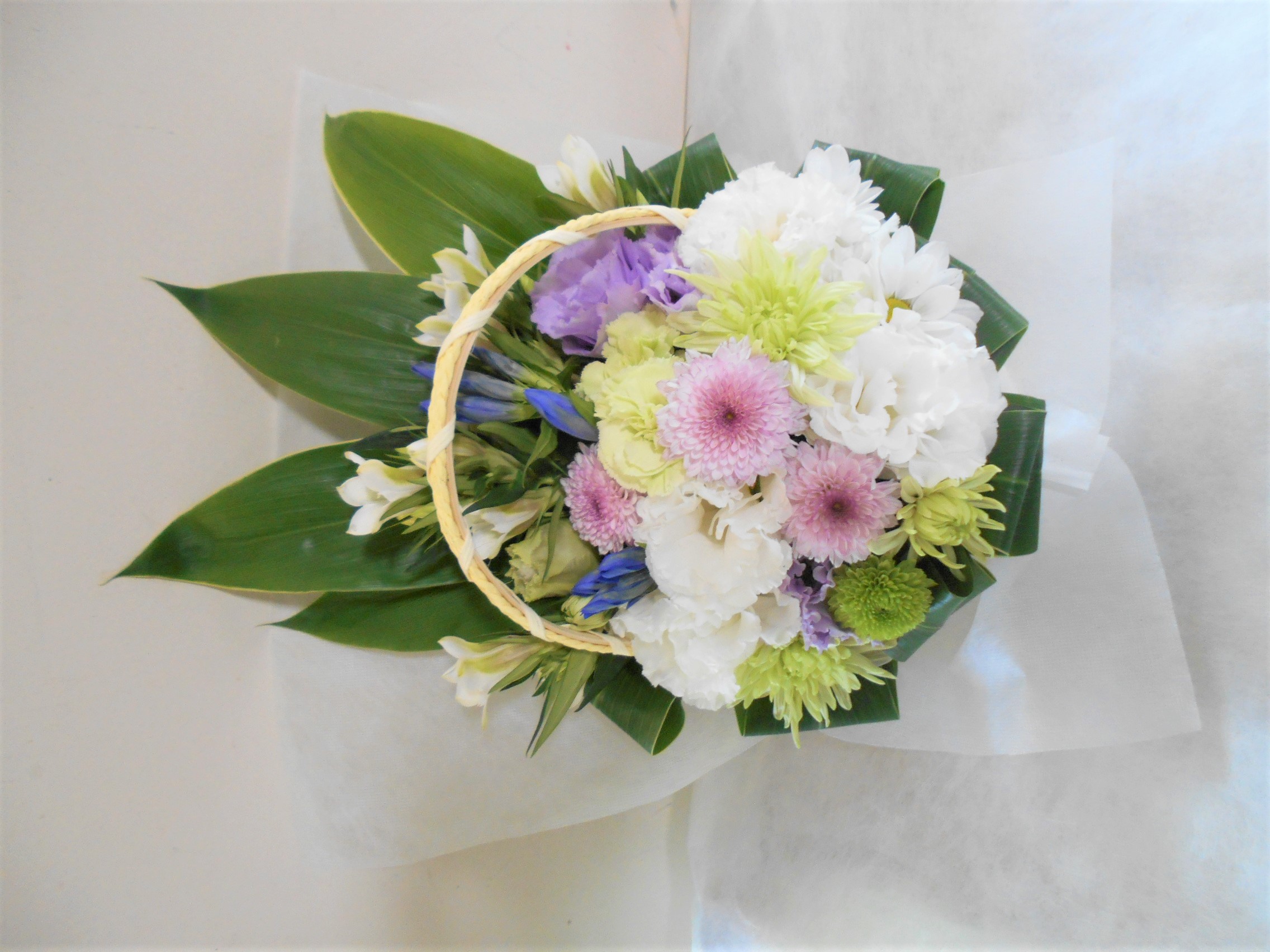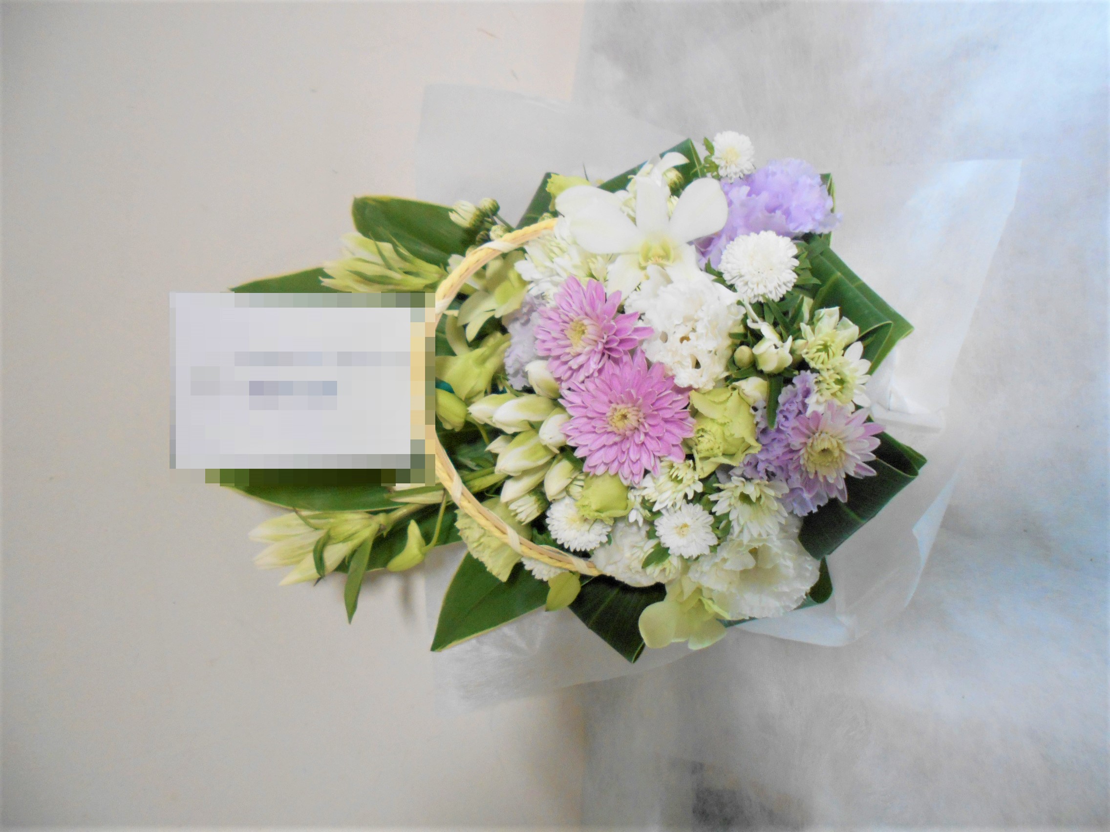 お悔やみ お供えの花 供花 (ホワイト&淡色カラーの手付きバスケットアレンジ)