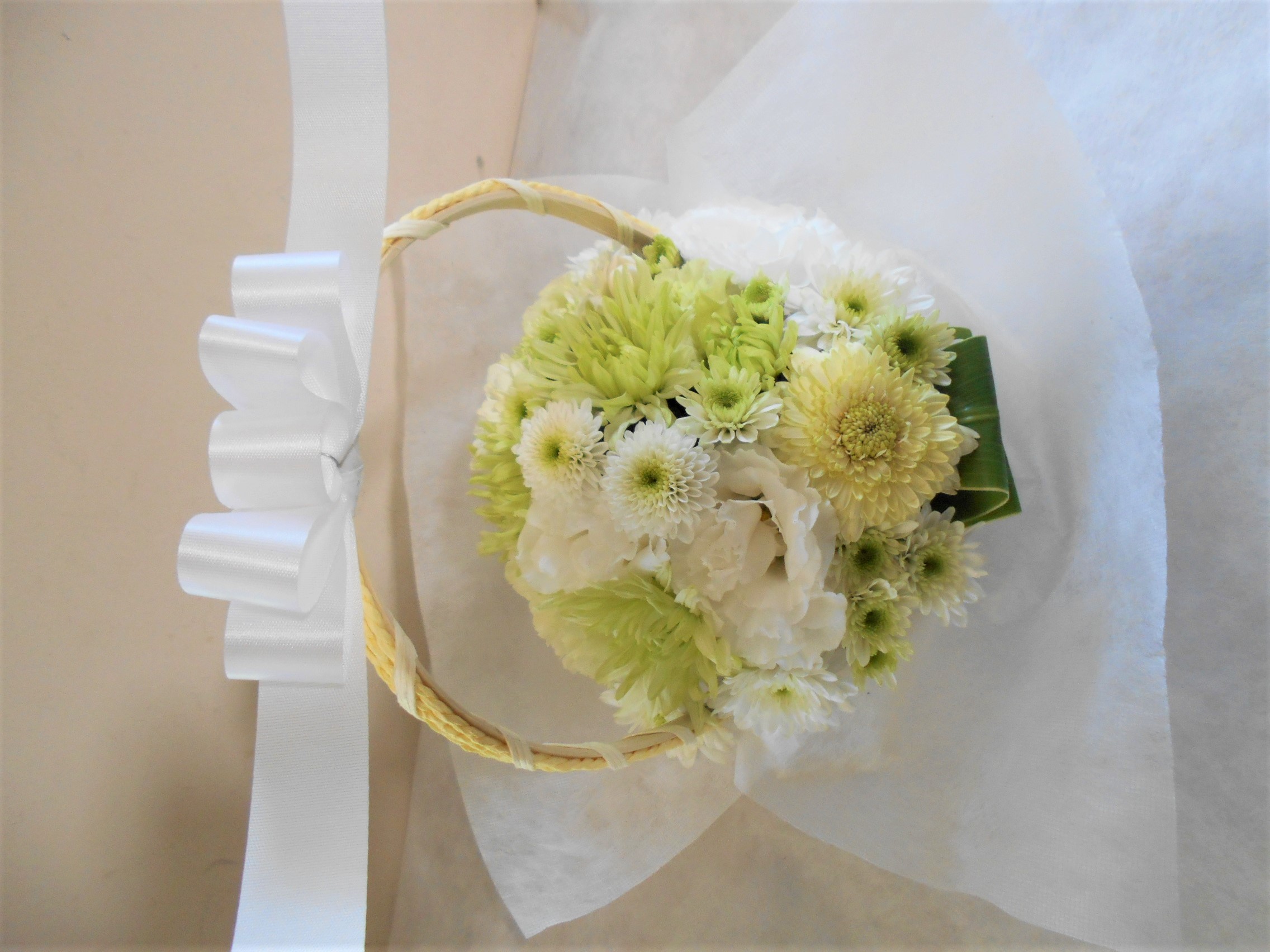 お悔やみ お供えの花 供花 (ホワイト&グリーンを基調にした手付きバスケットアレンジ)