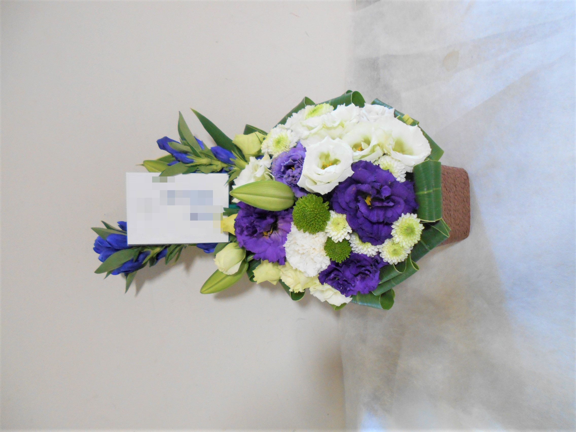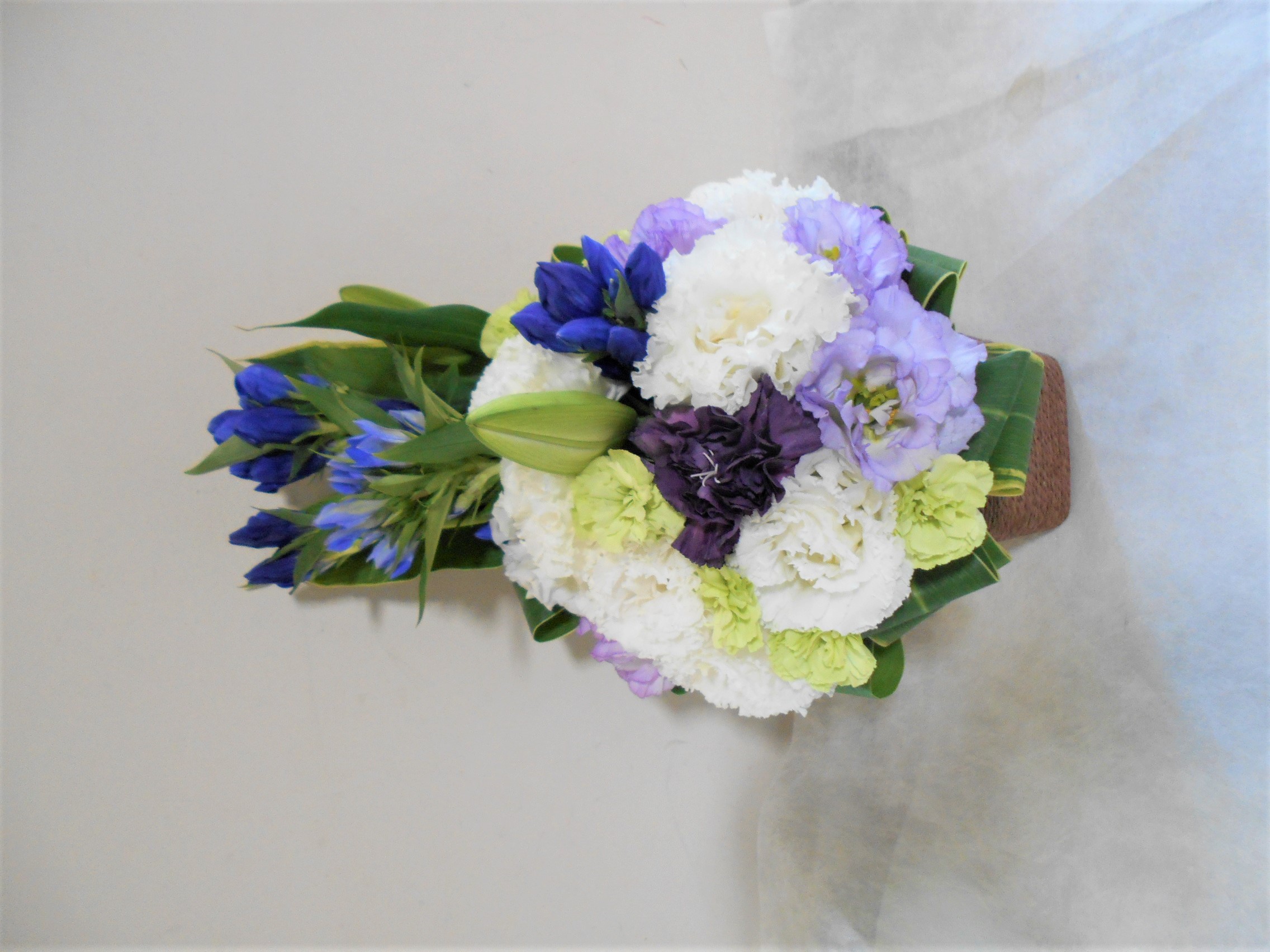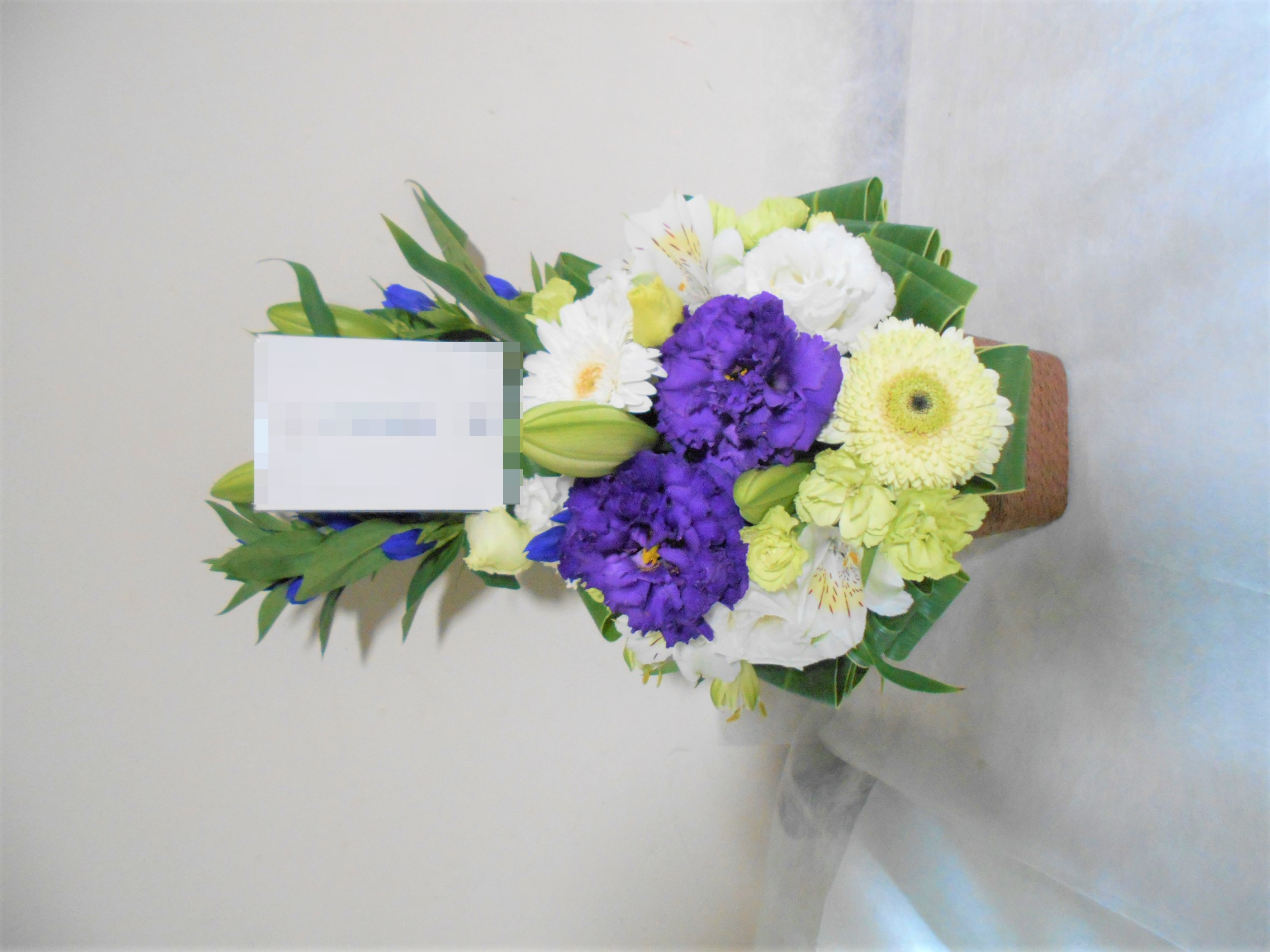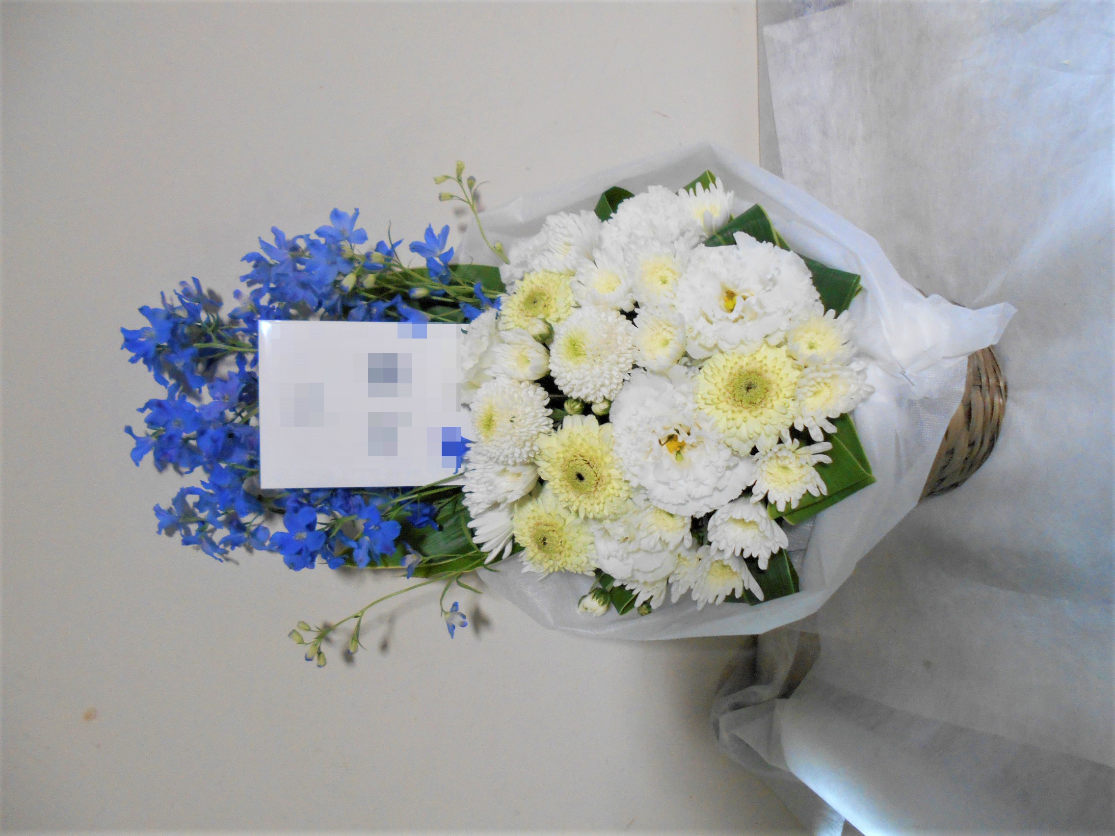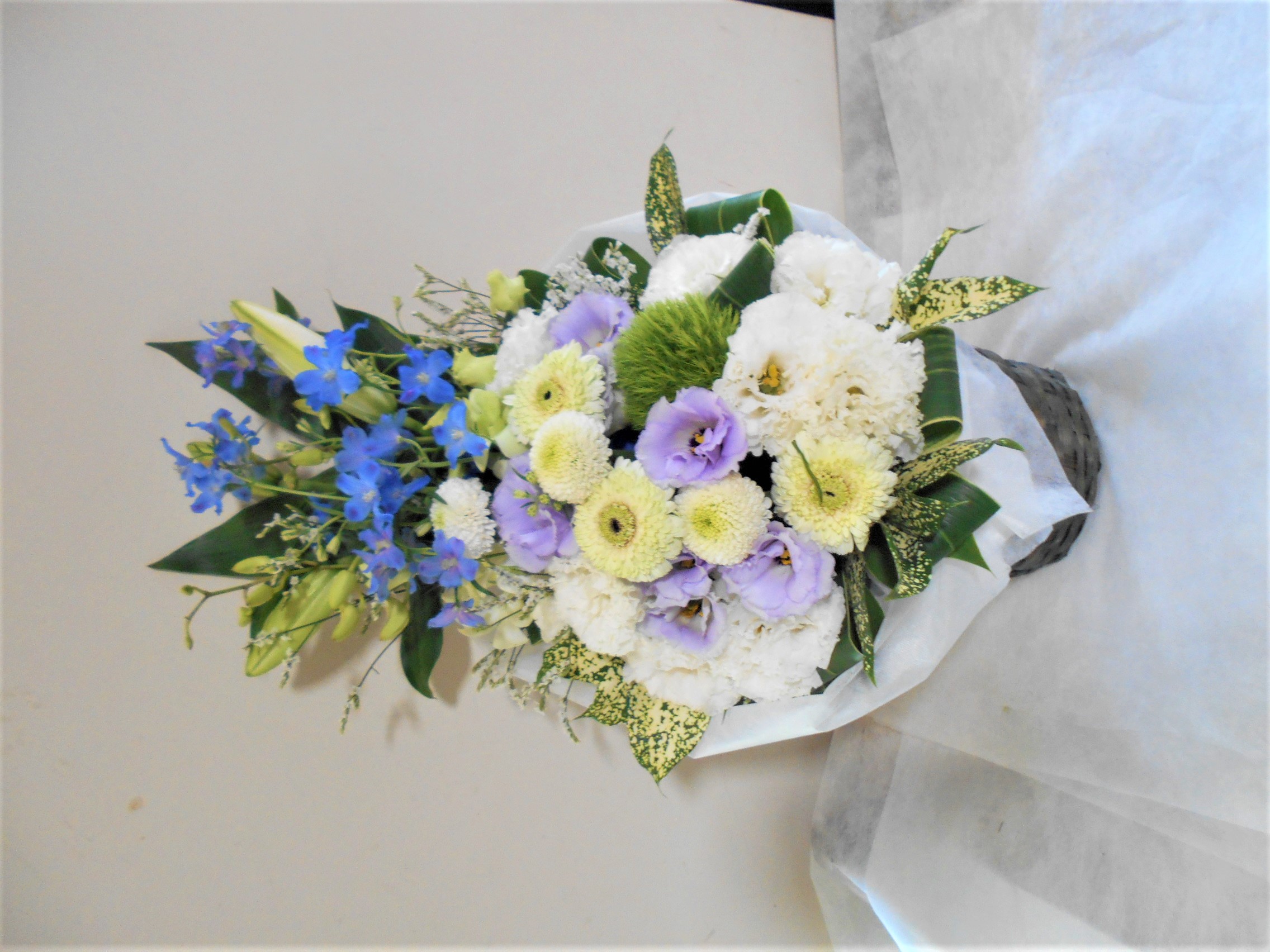 お悔やみ お供えの花 供花 (白基調に青系挿し色をそえたバスケットアレンジ)