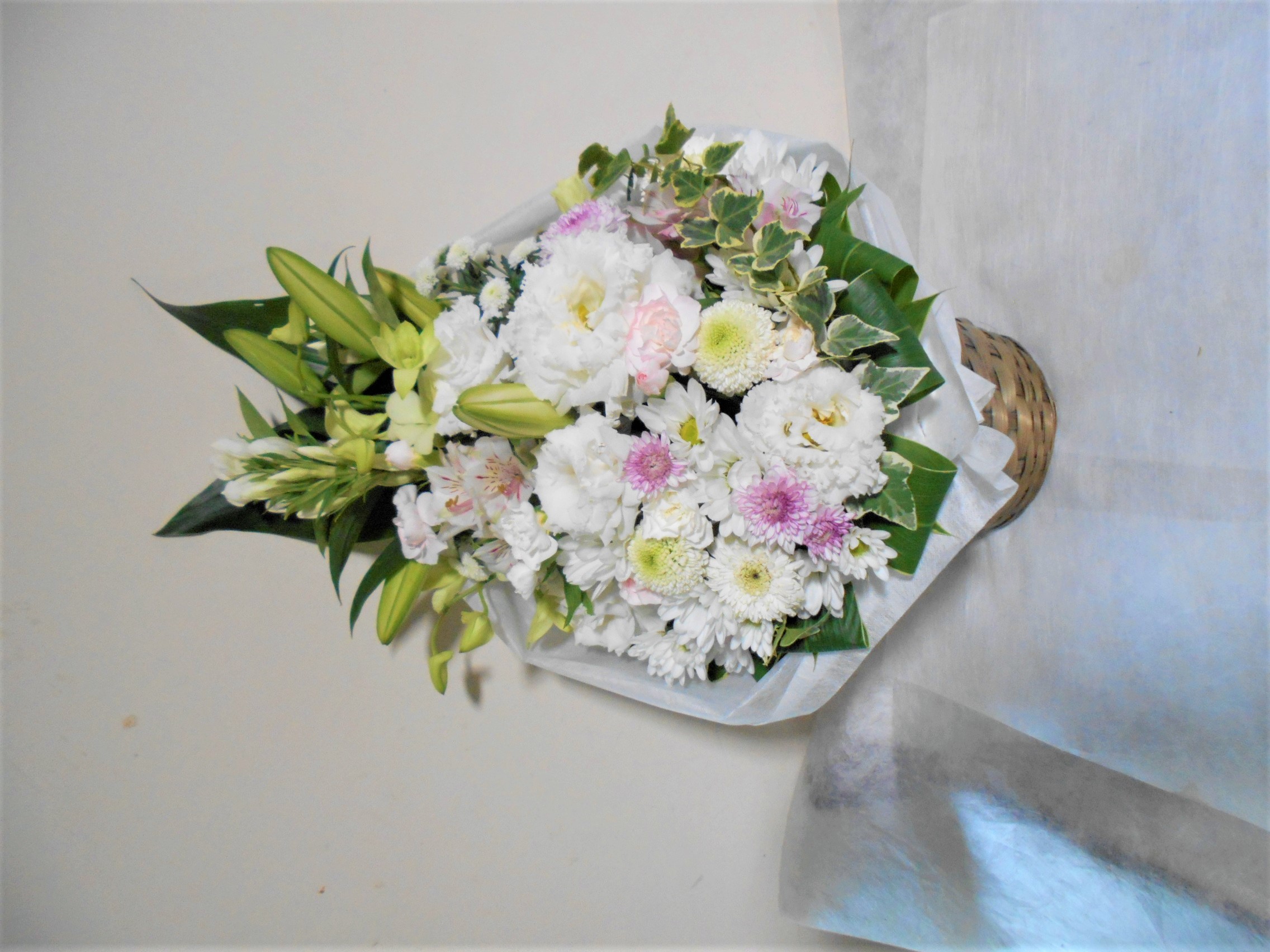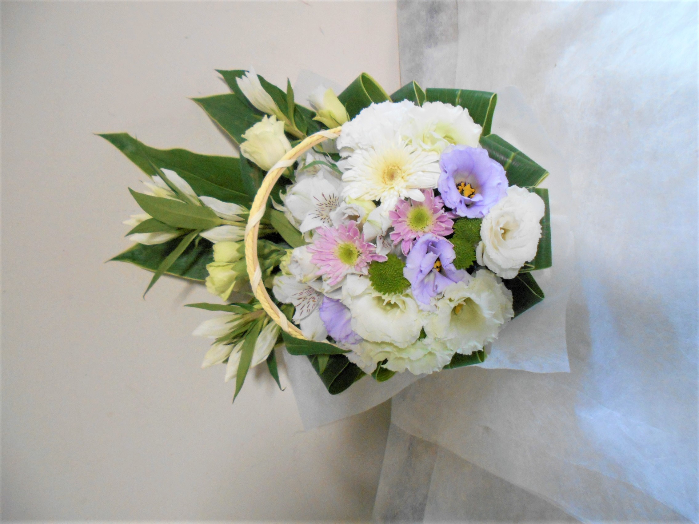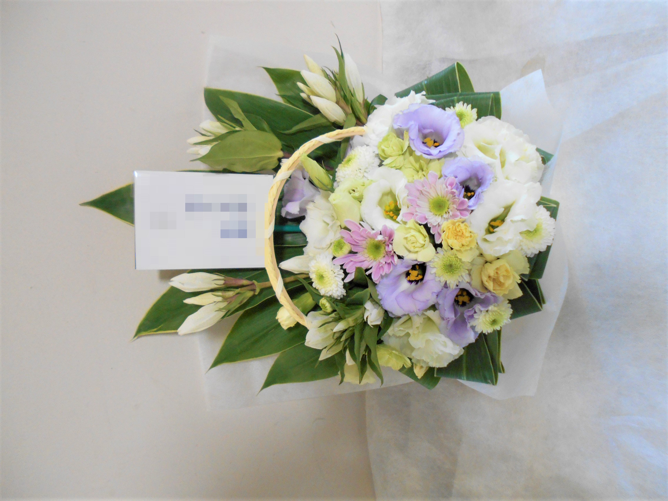 お悔やみ お供えの花 供花 (ホワイト&淡色カラーの手付きバスケットアレンジ)