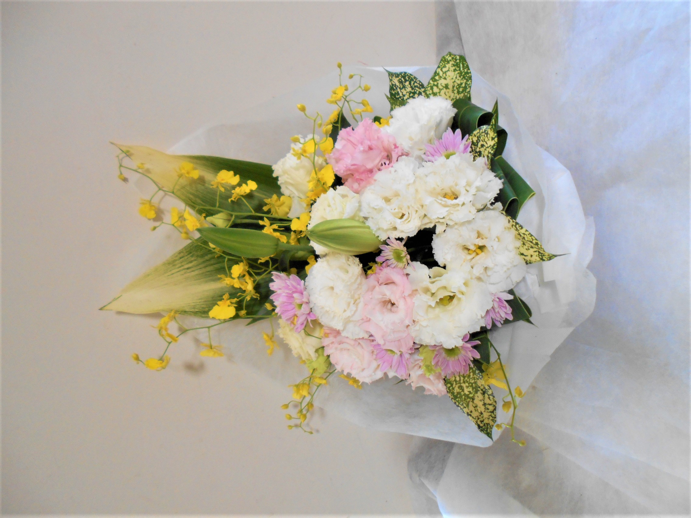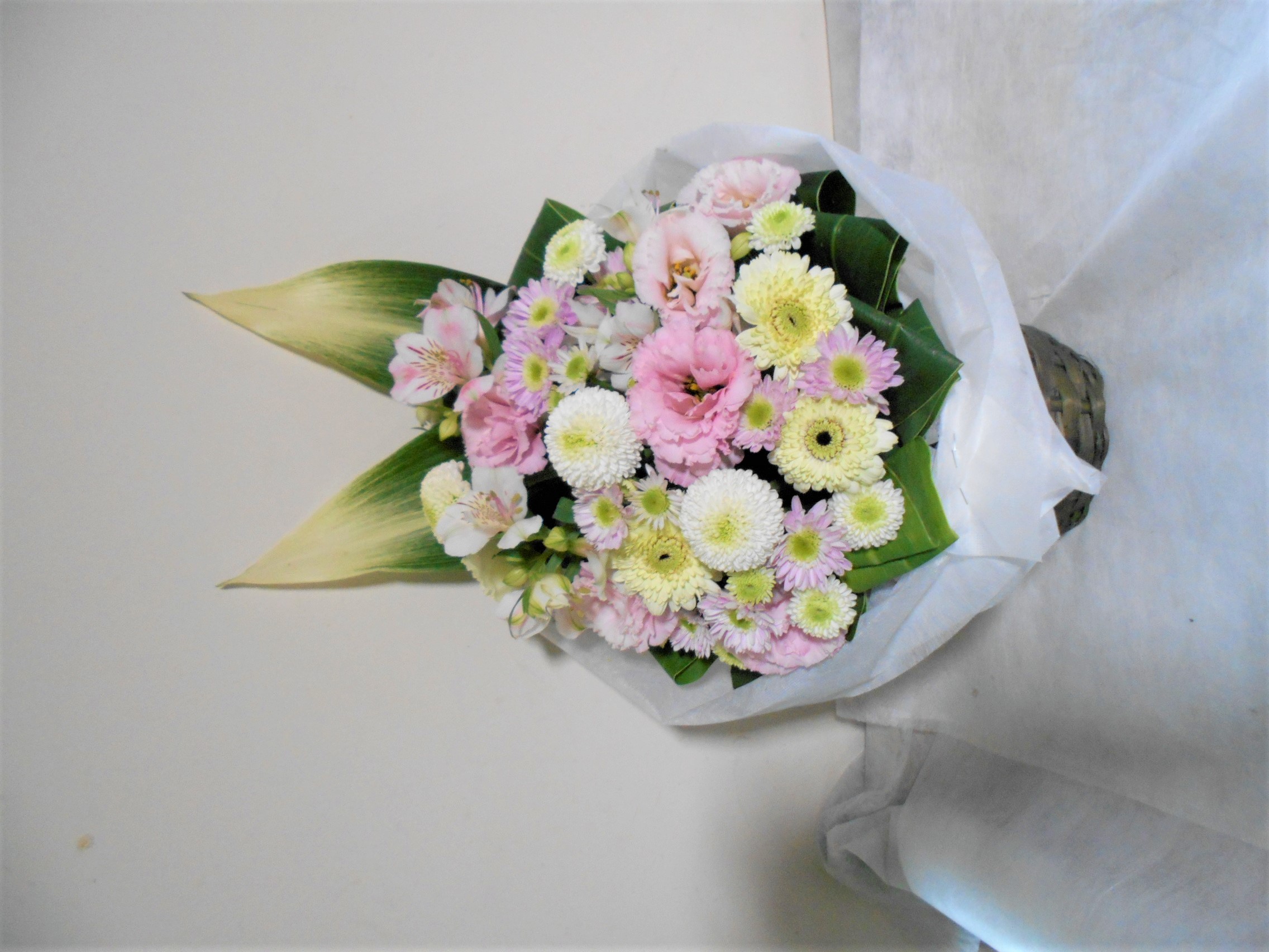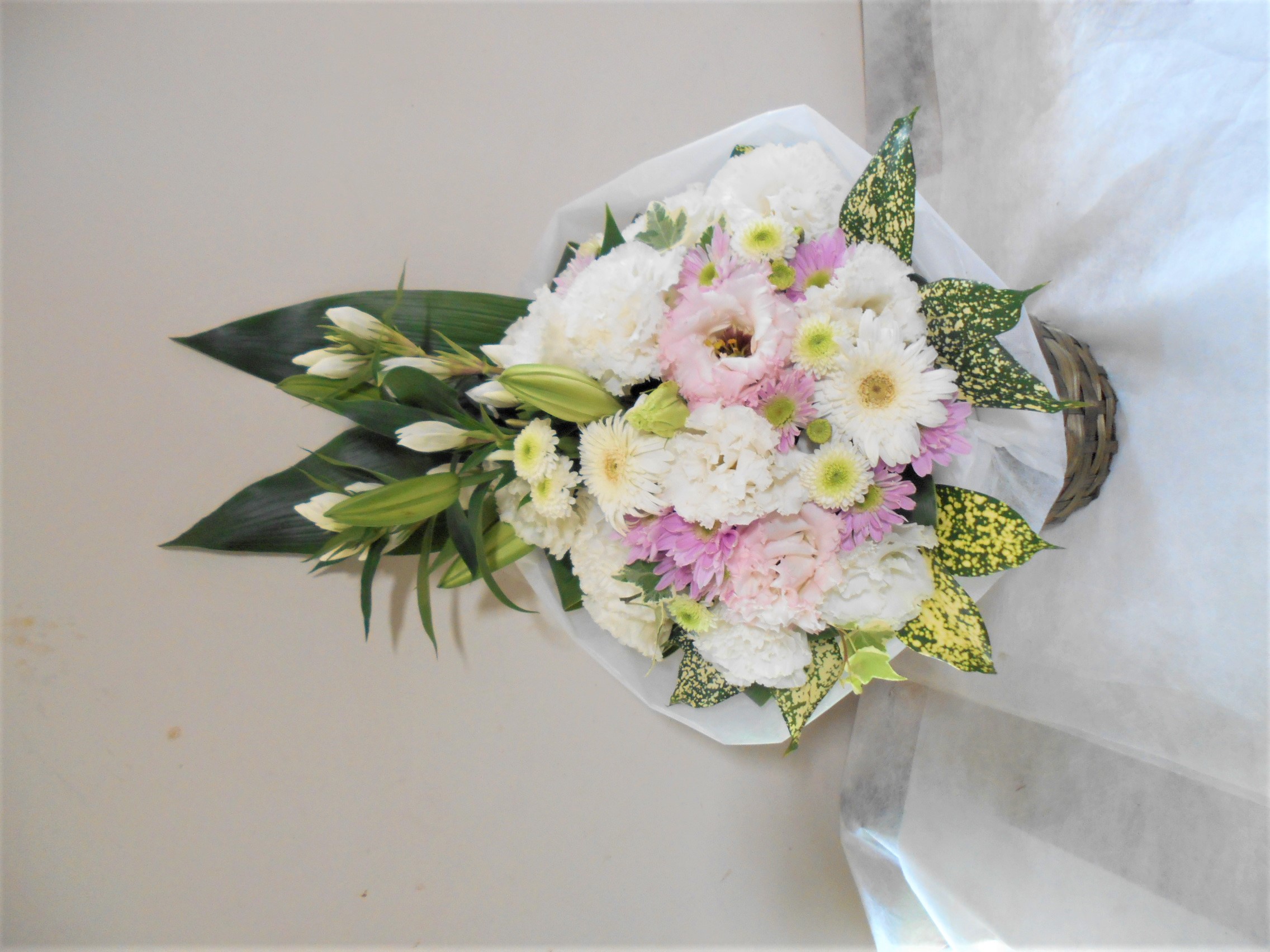 お悔やみ お供えの花 供花 (ホワイト&淡色カラーの手付きバスケットアレンジ)