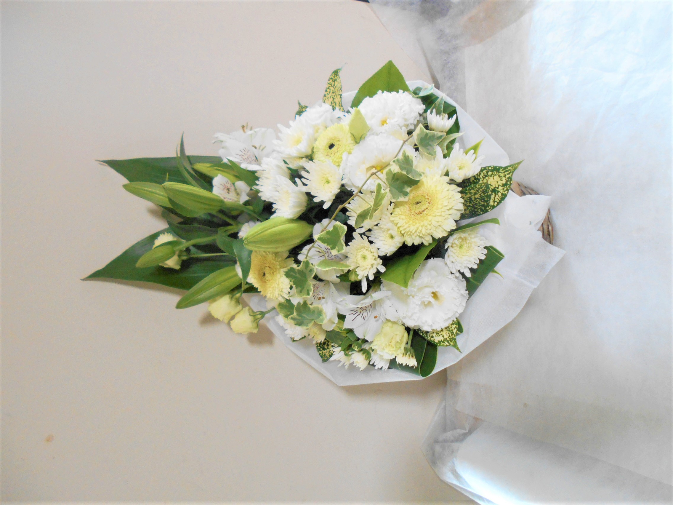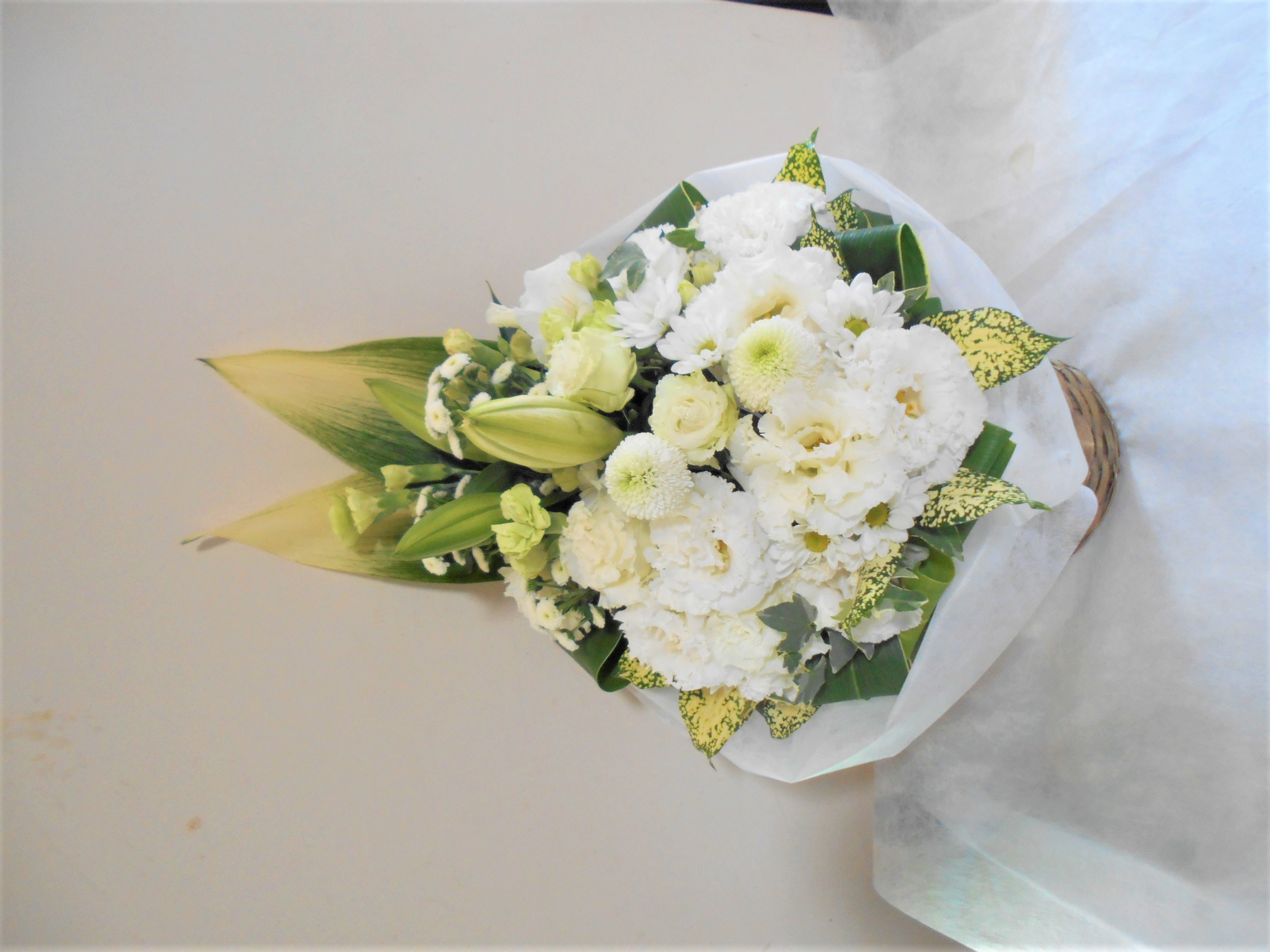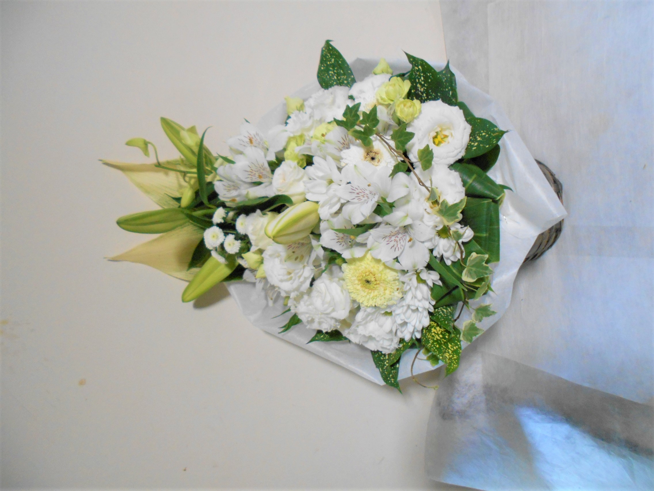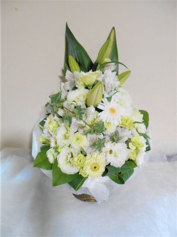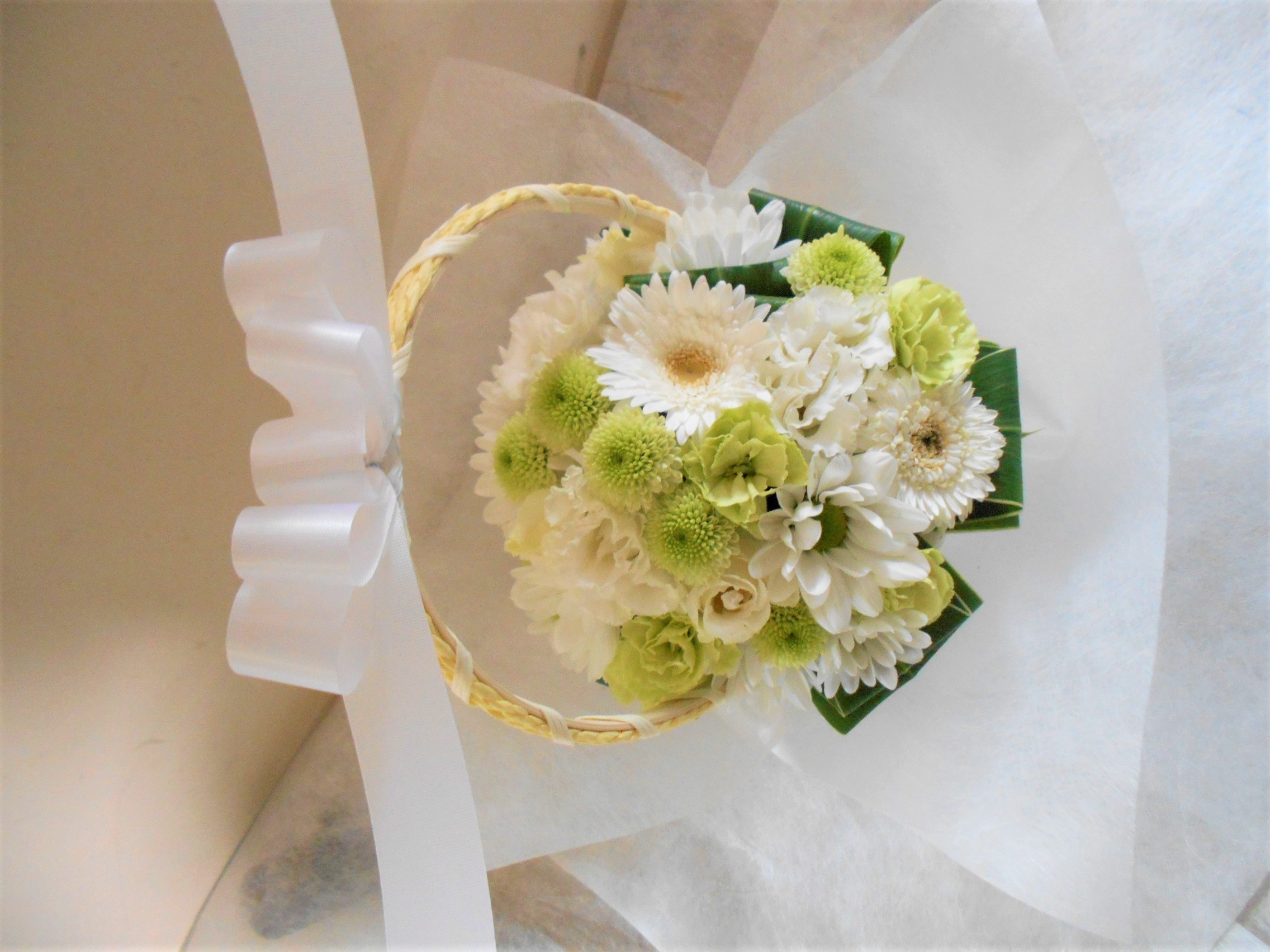 お悔やみ お供えの花 供花 (ホワイト&グリーンを基調にした手付きバスケットアレンジ)