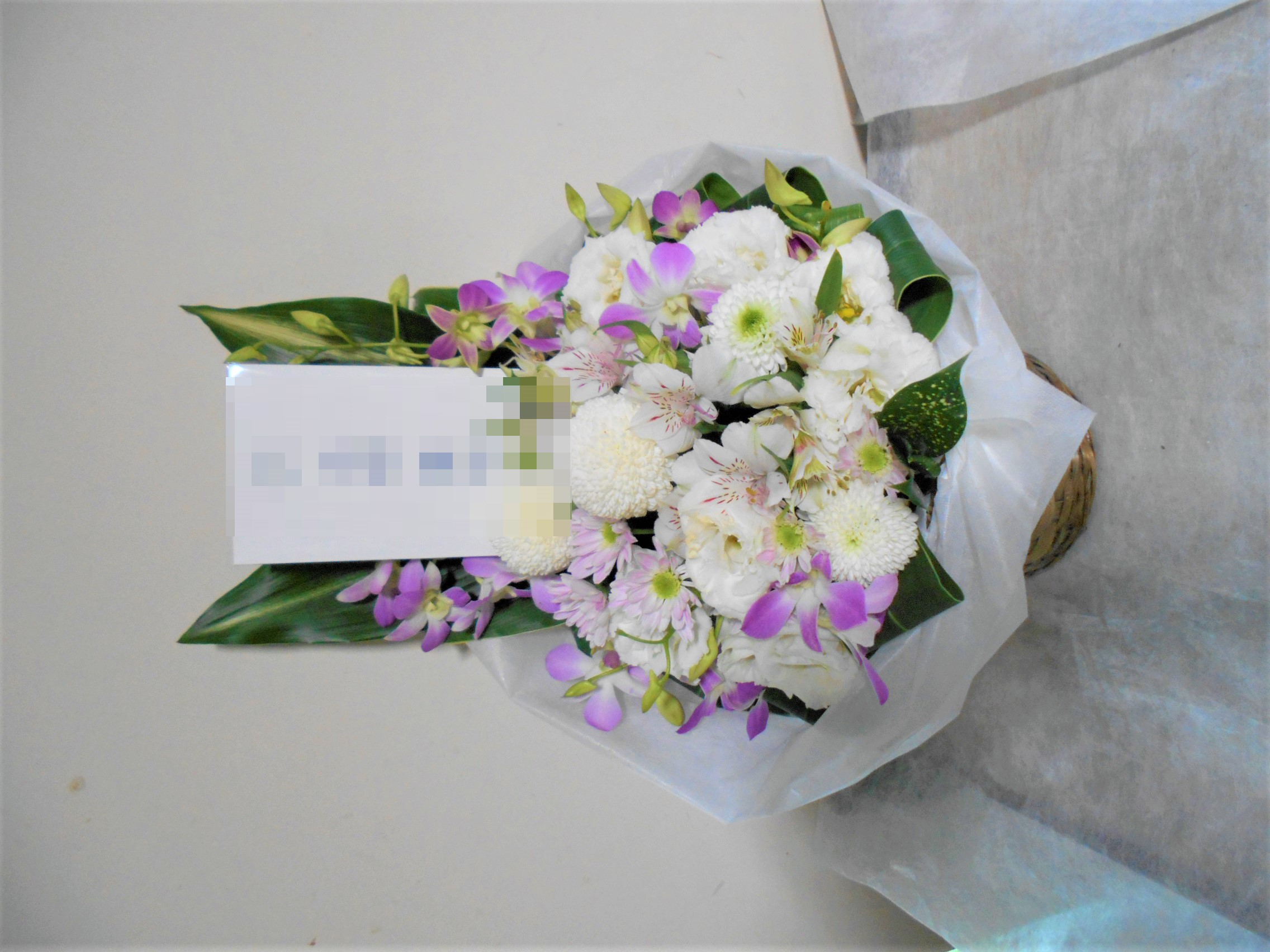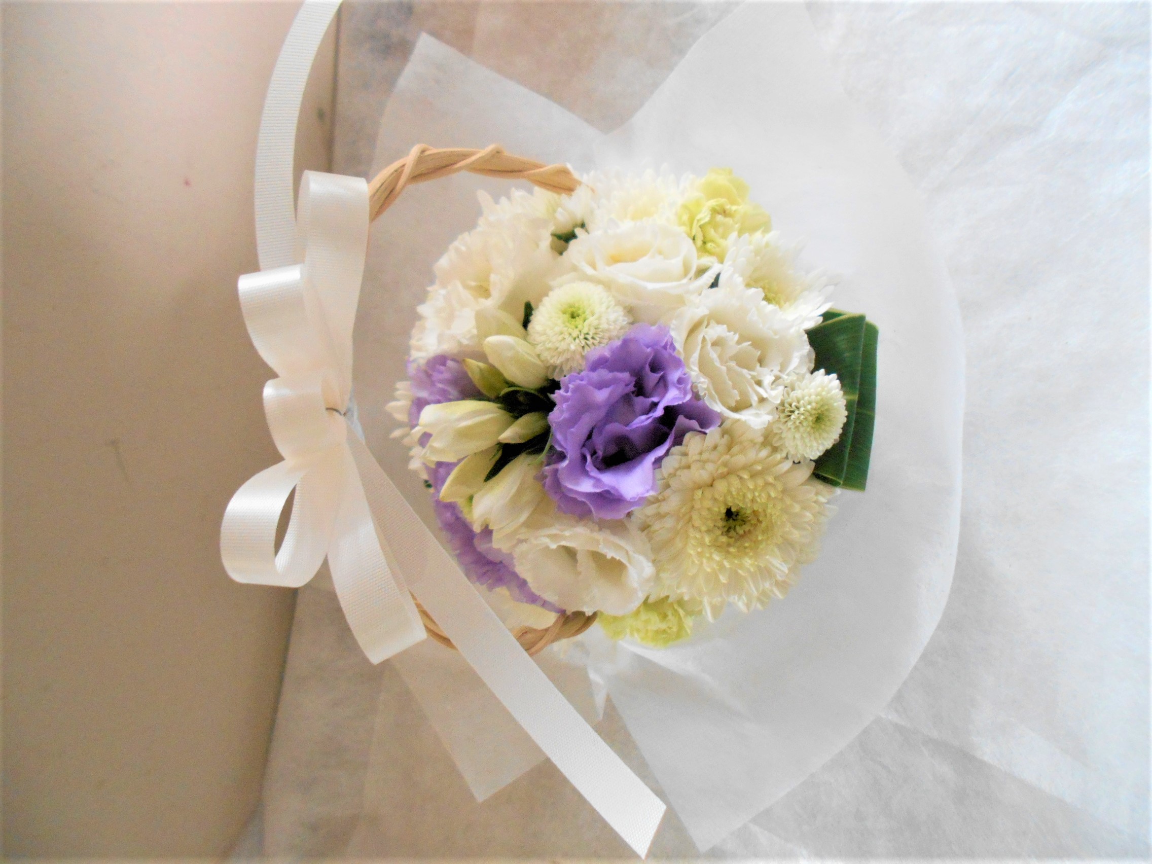 お悔やみ お供えの花 供花 (ホワイト&薄紫系でまとめた手付きのバスケットアレンジ)