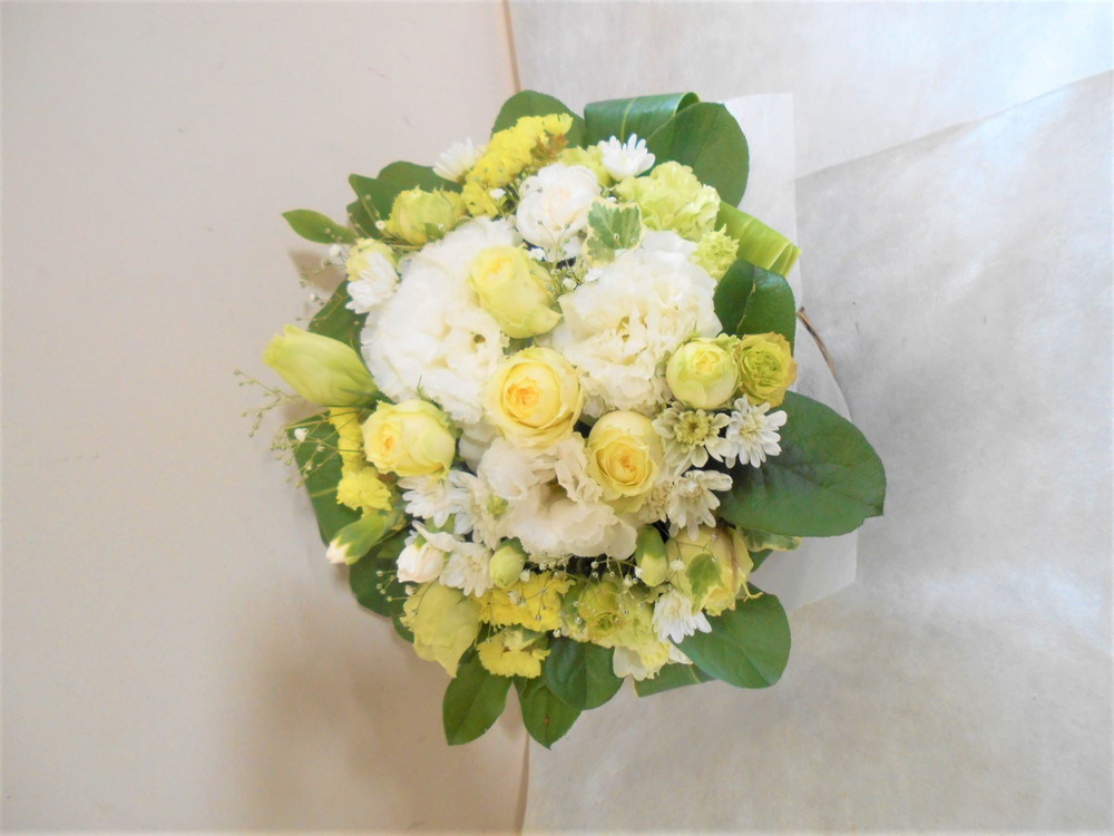 【白系】お悔やみ お供えの花 供花 (黄ユリをメインにホワイト系のお花でまとめたバスケットアレンジ)