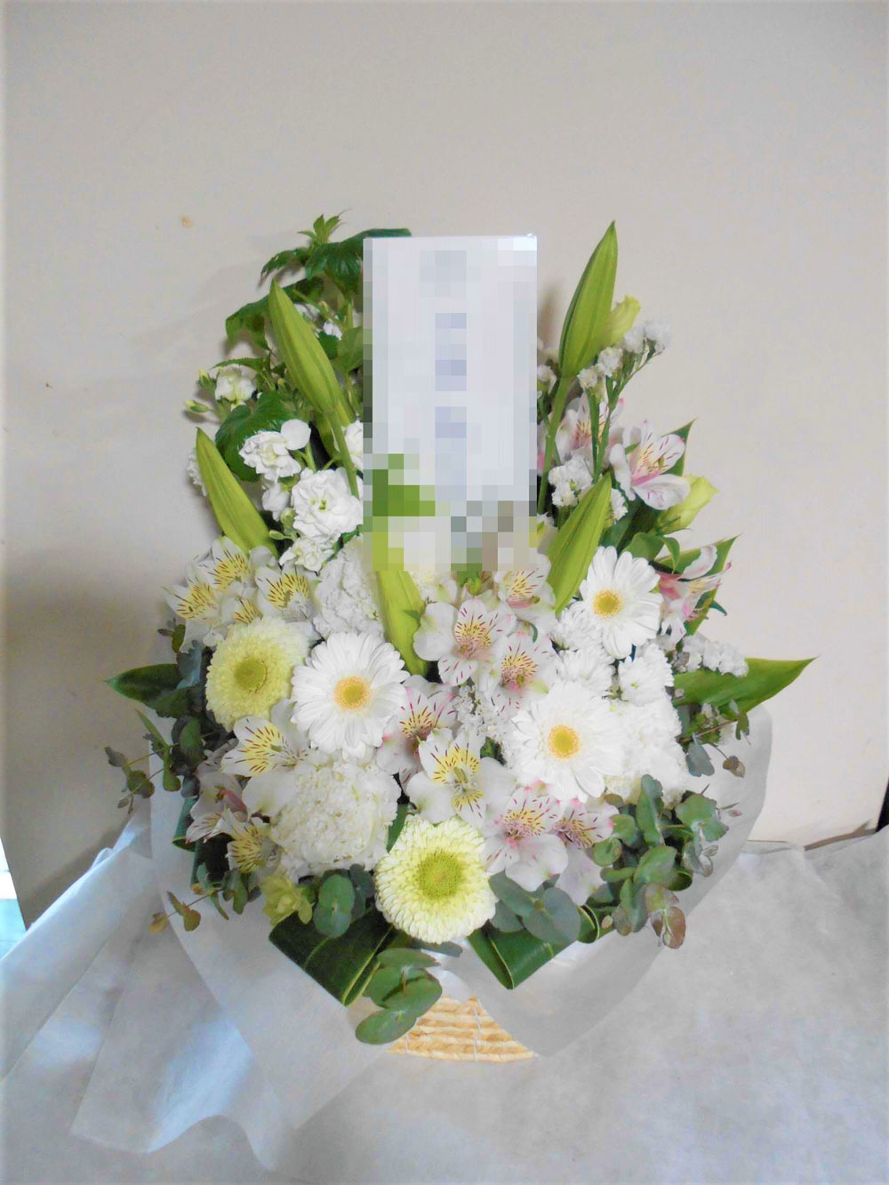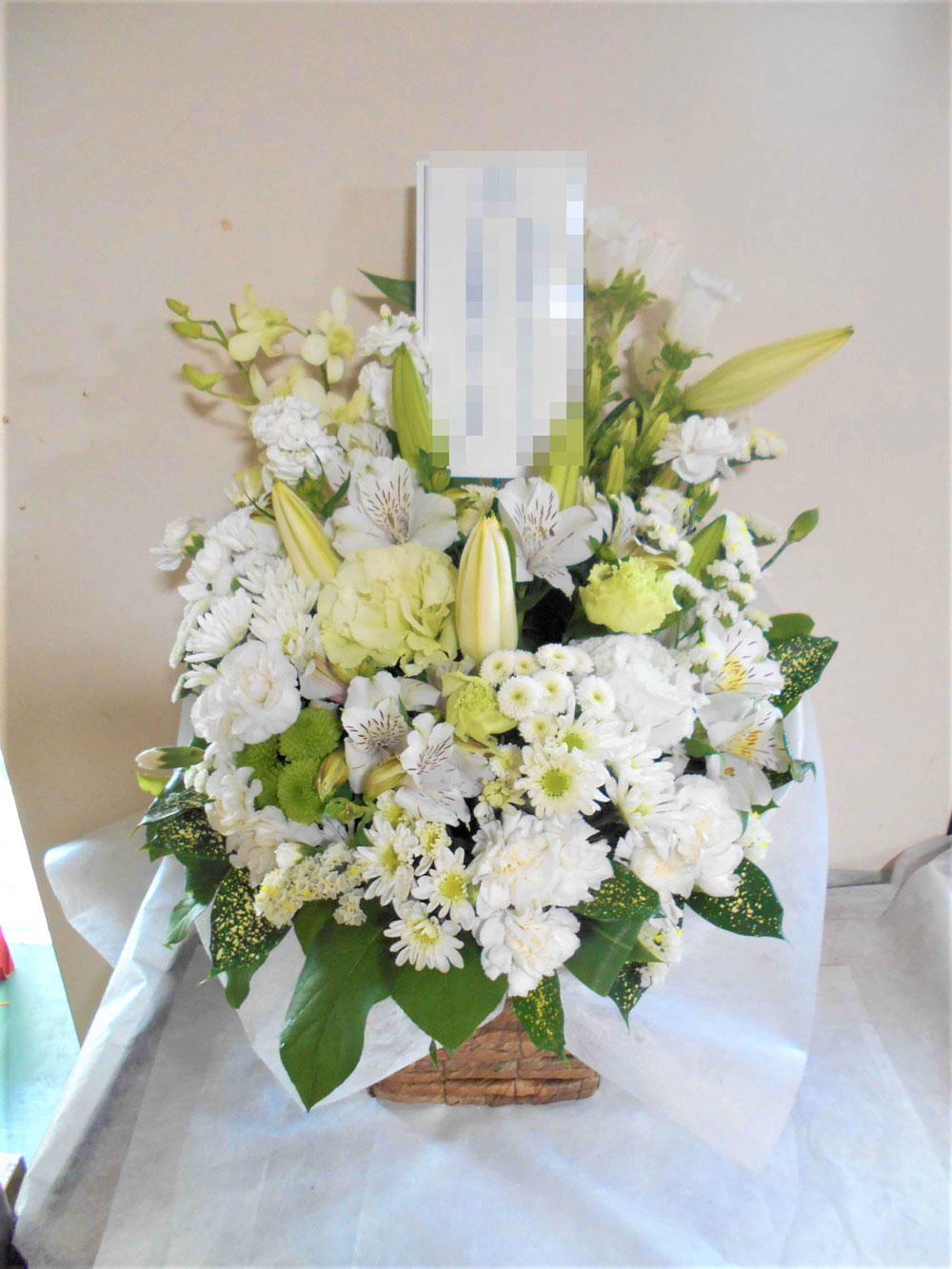 お悔やみ お供えの花 供花 (白ユリをメインにホワイト系にまとめた高さのあるバスケットアレンジ)