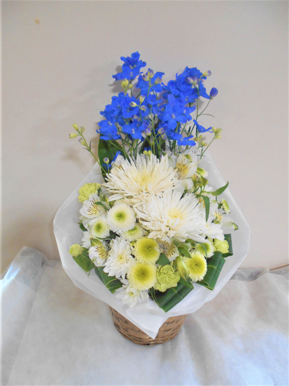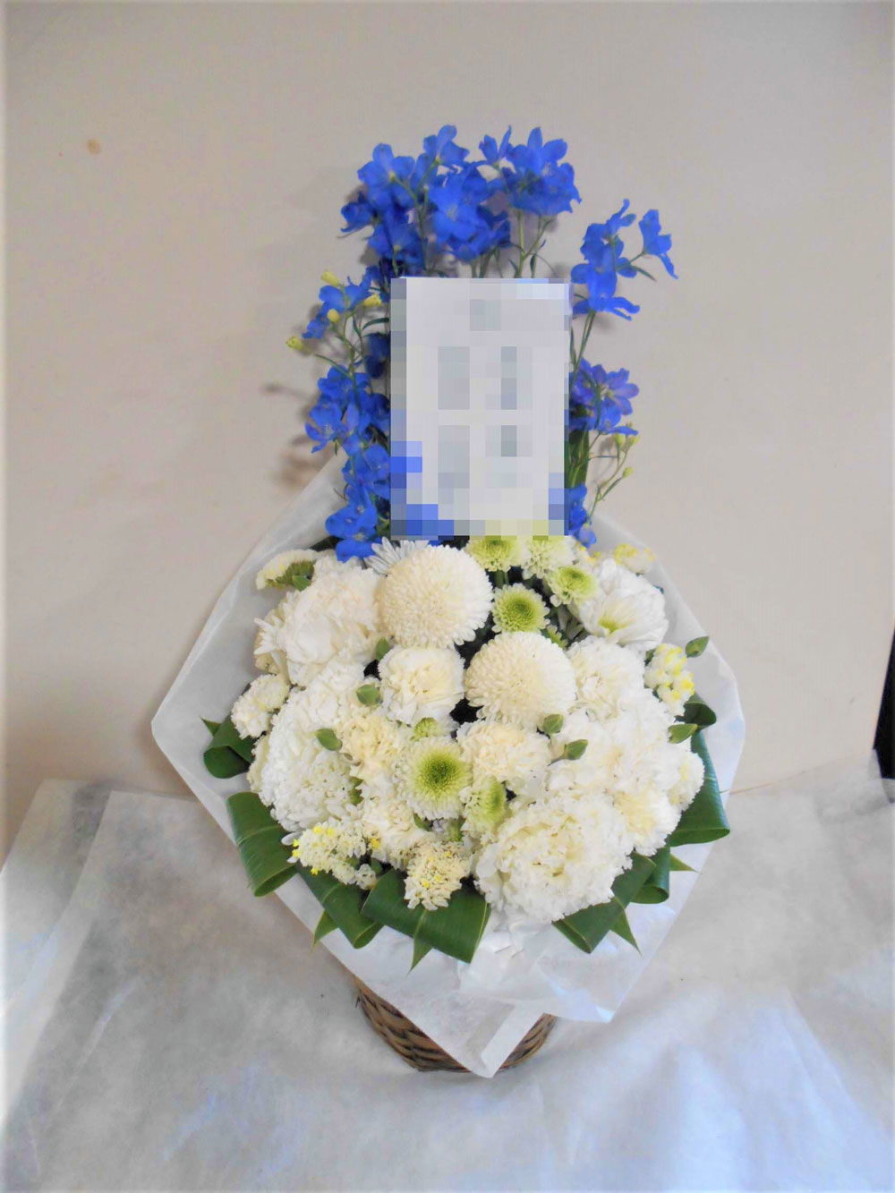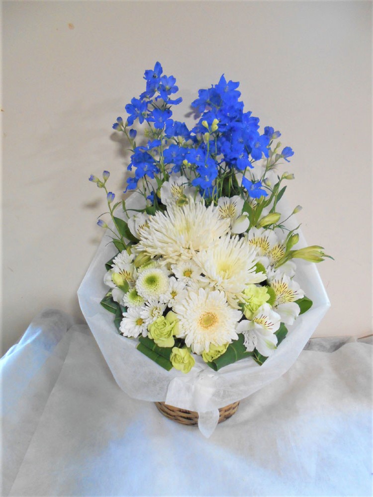 お悔やみ お供えの花 供花 (白基調に青系挿し色をそえたバスケットアレンジ)