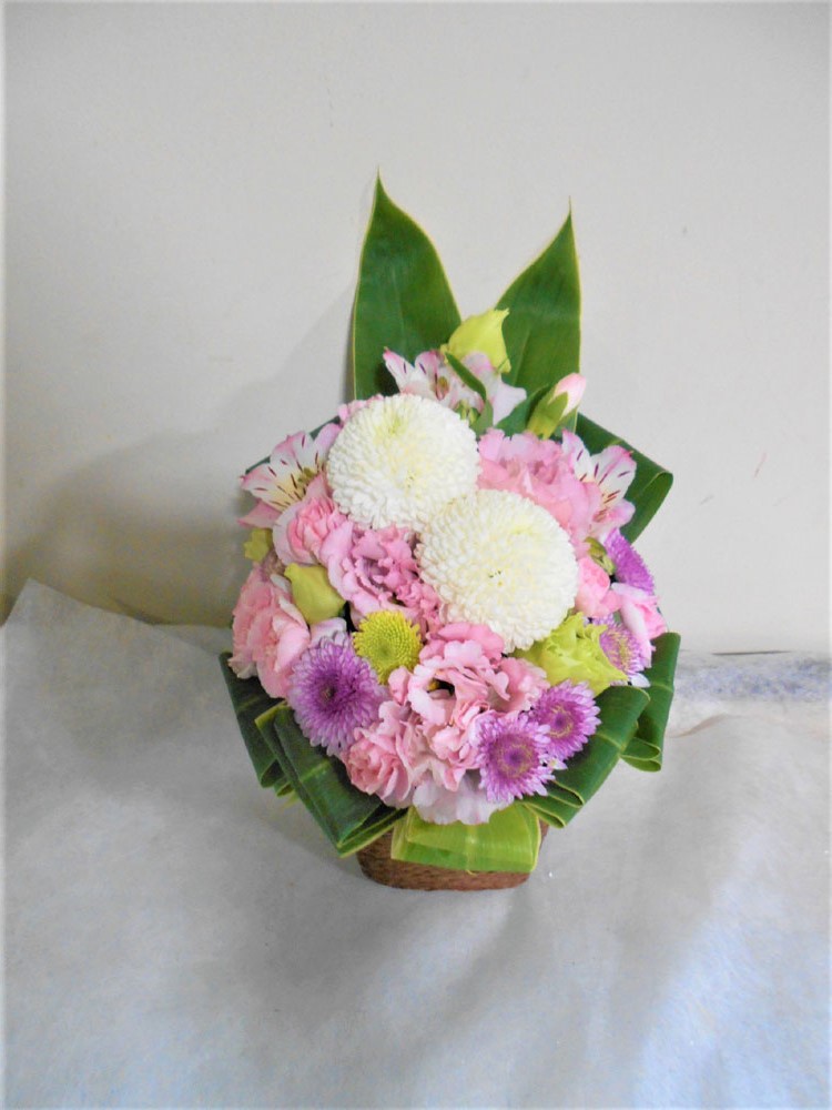 お悔やみ お供えの花 供花 (ホワイト&ピンクでまとめたバスケットアレンジ)