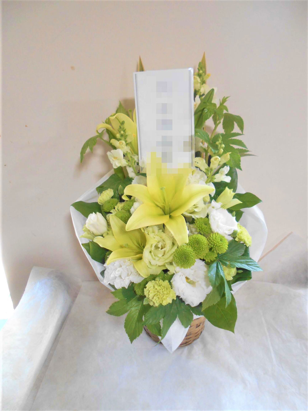 お悔やみ お供えの花 供花 (黄ユリをメインにホワイト系でまとめたバスケットアレンジ)