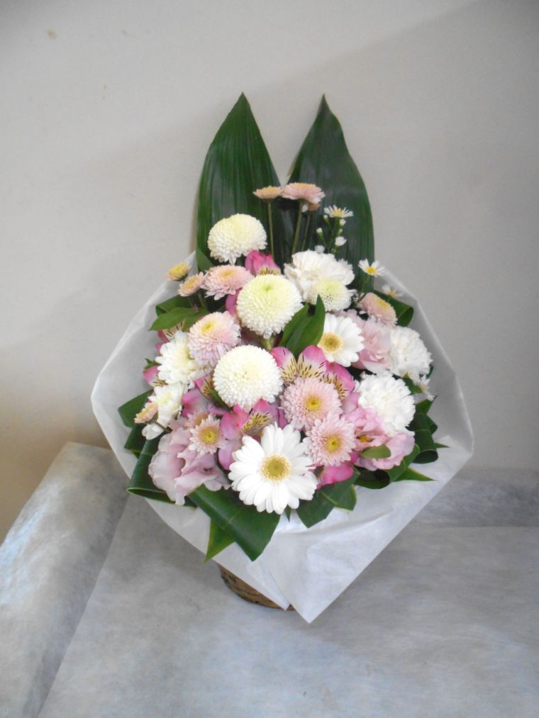 【白系】お悔やみ お供えの花 供花 (淡いピンク系のお花でまとめたバスケットアレンジ)