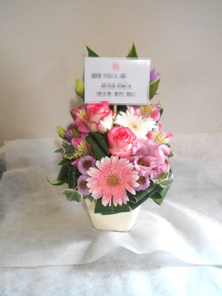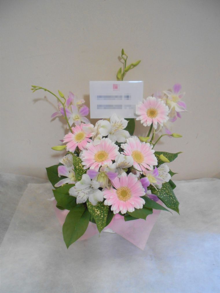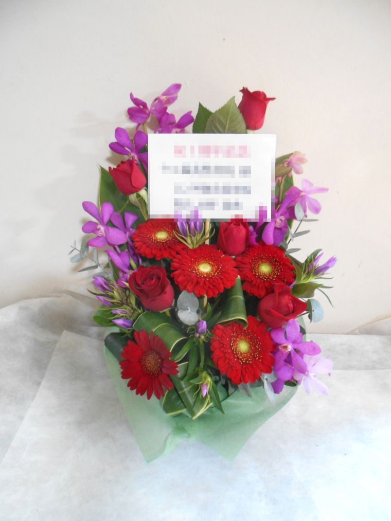 アレンジメントの実際にお届けした写真です。花秘書では発送前に写真をメールで送信致しますので安心して大切な顧客や取引様へのギフトにご利用頂けます。