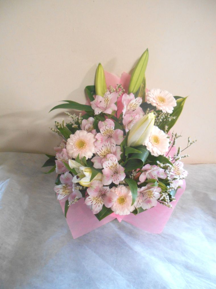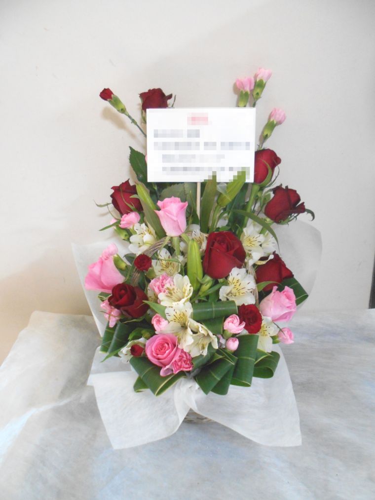 アレンジメントの実際にお届けした写真です。花秘書では発送前に写真をメールで送信致しますので安心して大切な顧客や取引様へのギフトにご利用頂けます。