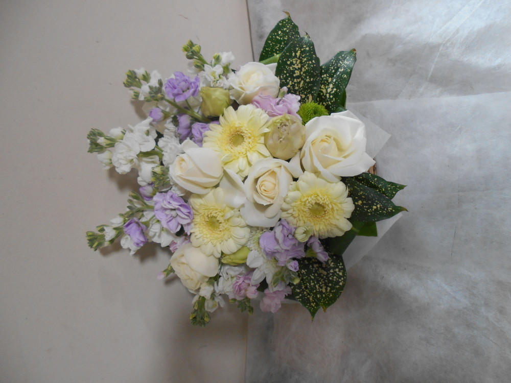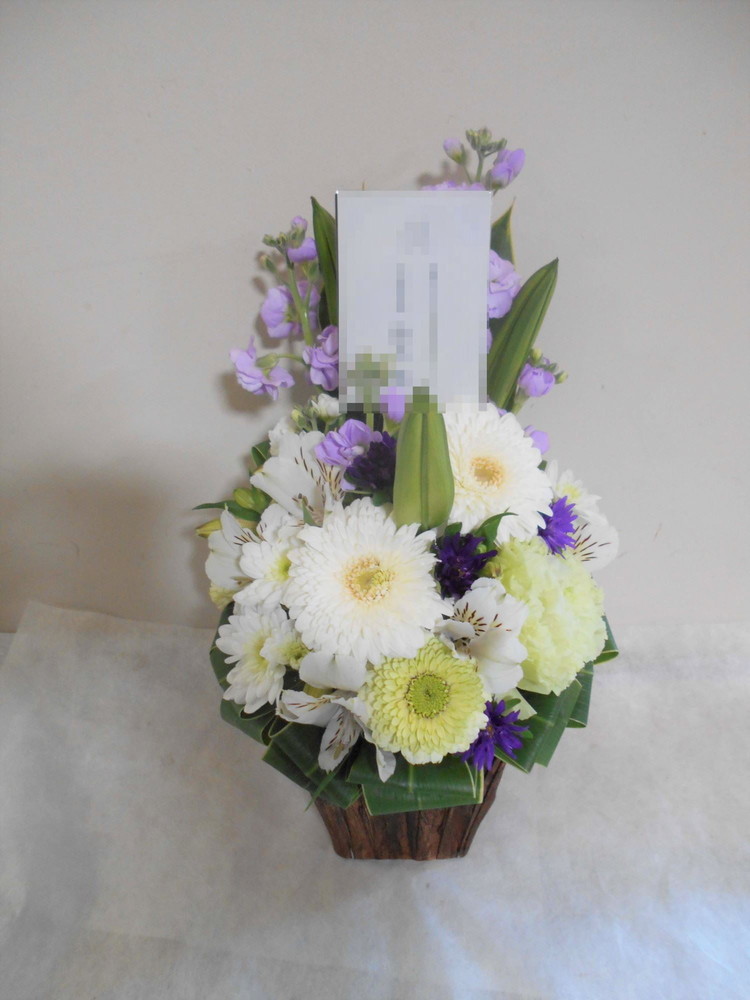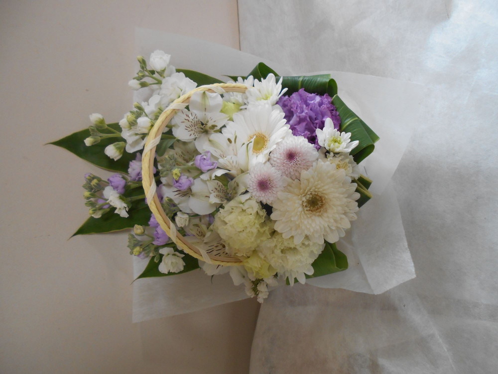 お悔やみ お供えの花 供花 (ホワイト&薄紫系でまとめた手付きのバスケットアレンジ)