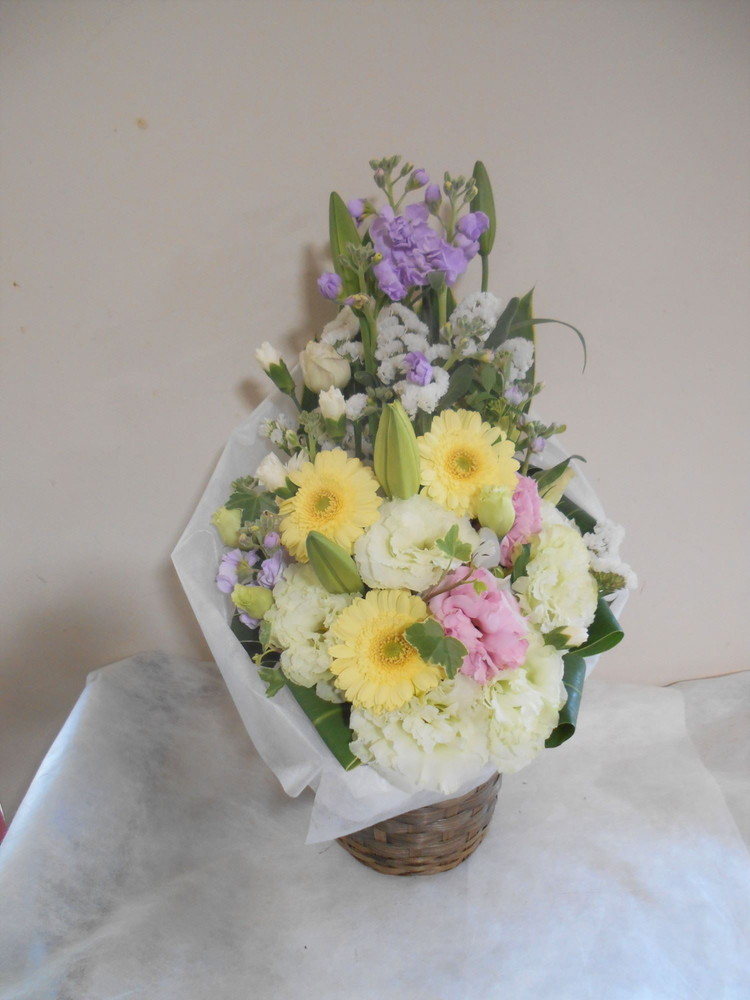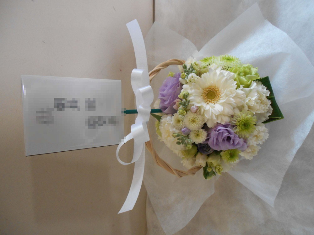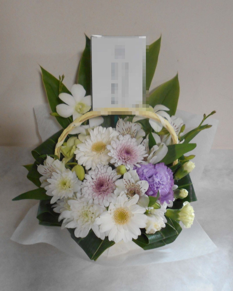 お悔やみ お供えの花 供花 (ホワイト&淡色カラーの手付きバスケットアレンジ)