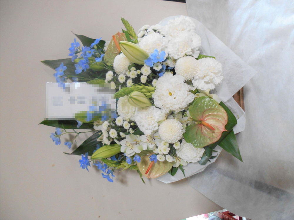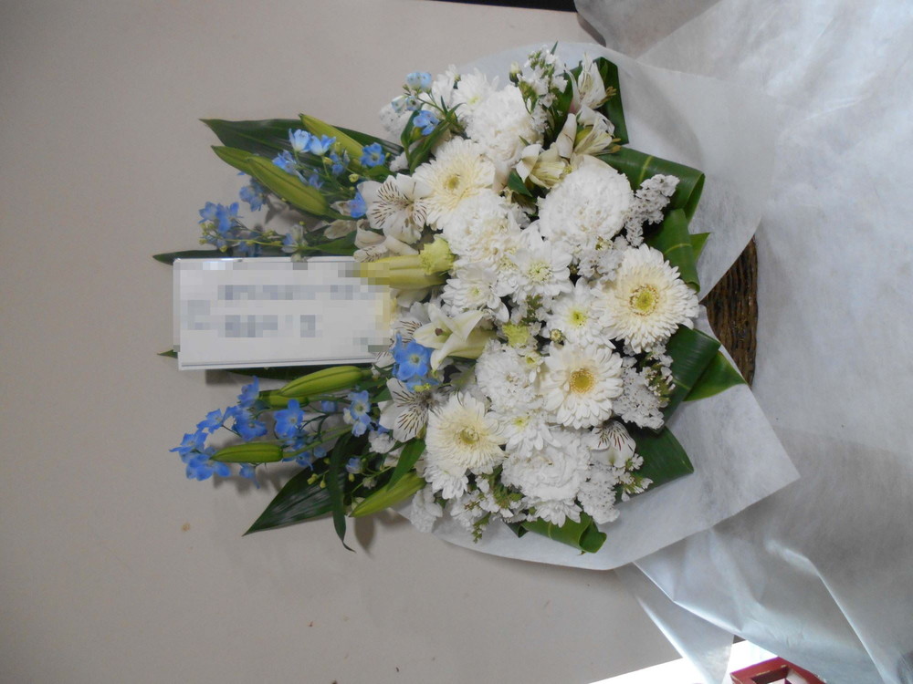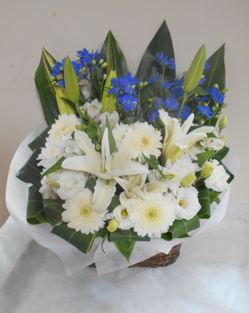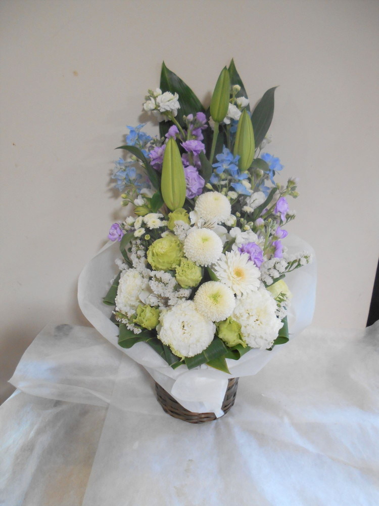 お悔やみ お供えの花 供花 (ホワイト&青・紫系カラーのお花でまとめたバスケットアレンジ)