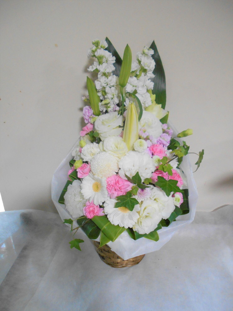 お悔やみ お供えの花 供花 (ホワイト&ピンクでまとめたバスケットアレンジ)