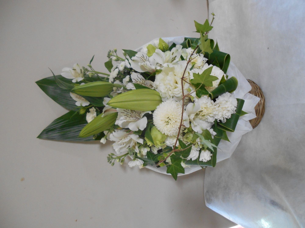 お悔やみ お供えの花 供花 (白ユリをメインにホワイト&グリーンでまとめたバスケットアレンジ)