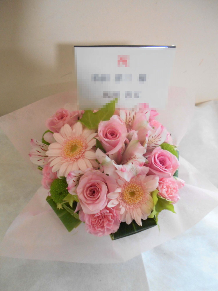 アレンジメントの実際にお届けした写真です。花秘書では発送前に写真をメールで送信致しますので安心して大切な顧客や取引様へのギフトにご利用頂けます。