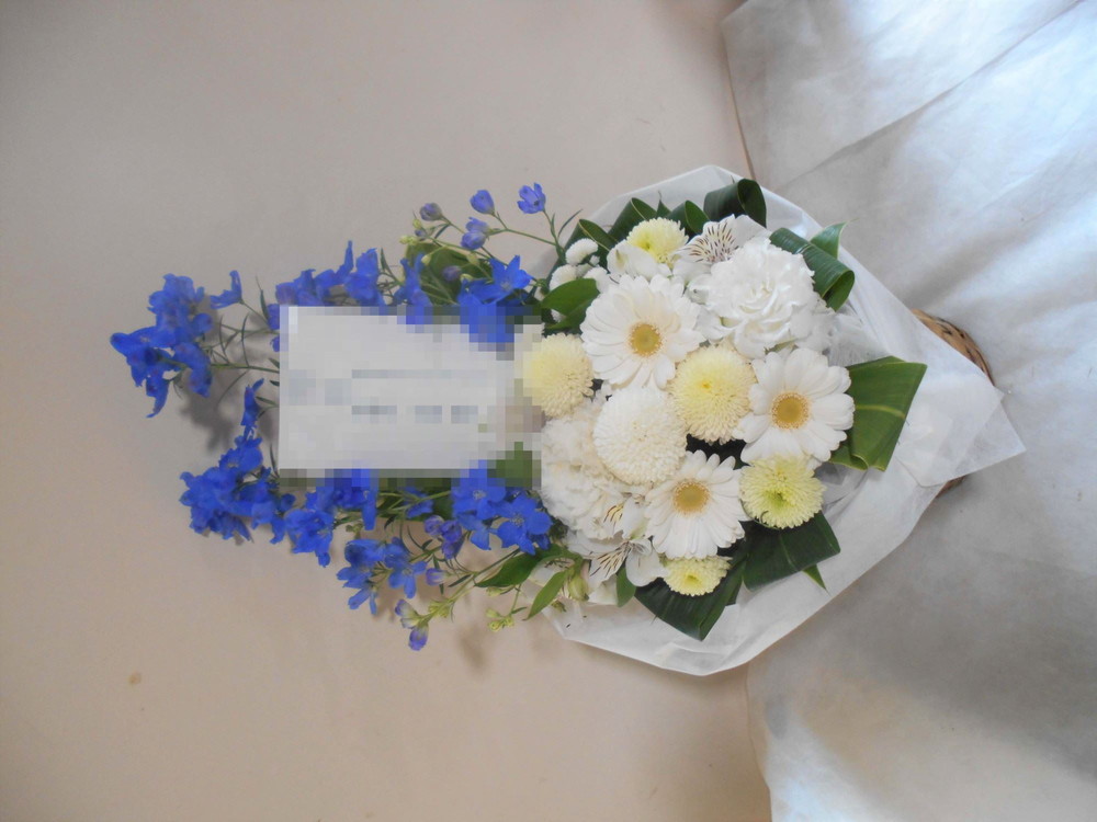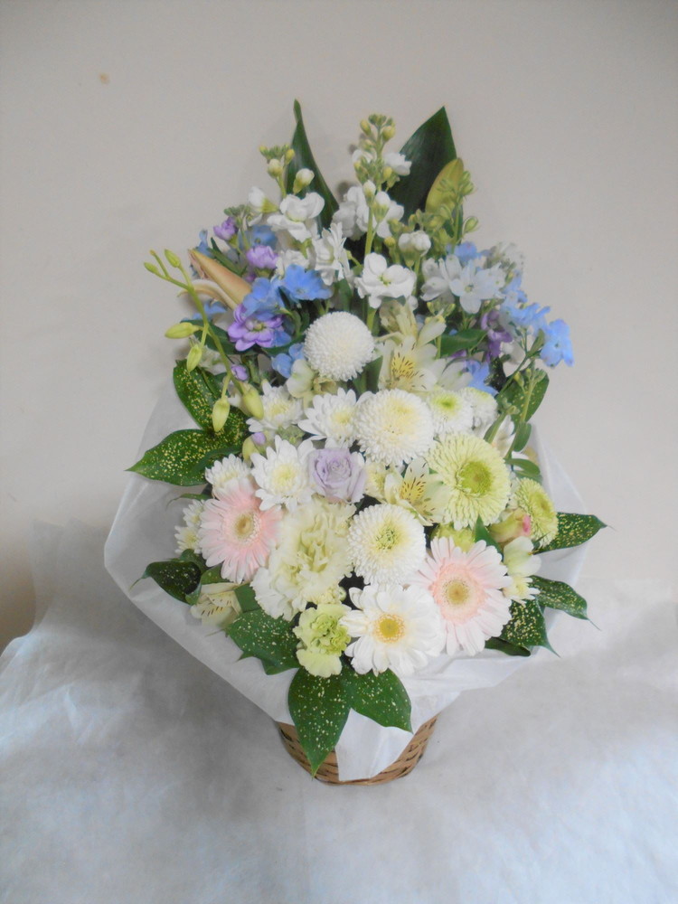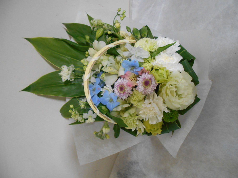 お悔やみ お供えの花 供花 (白基調に青系挿し色をそえたバスケットアレンジ)