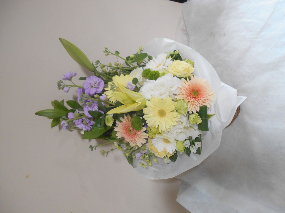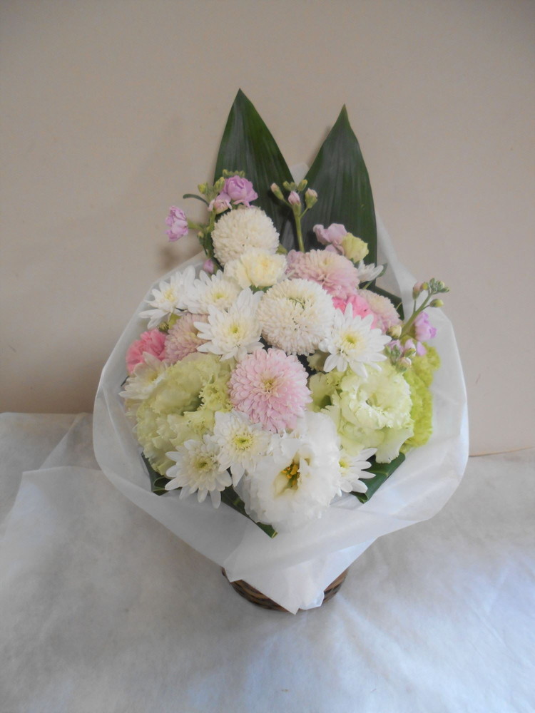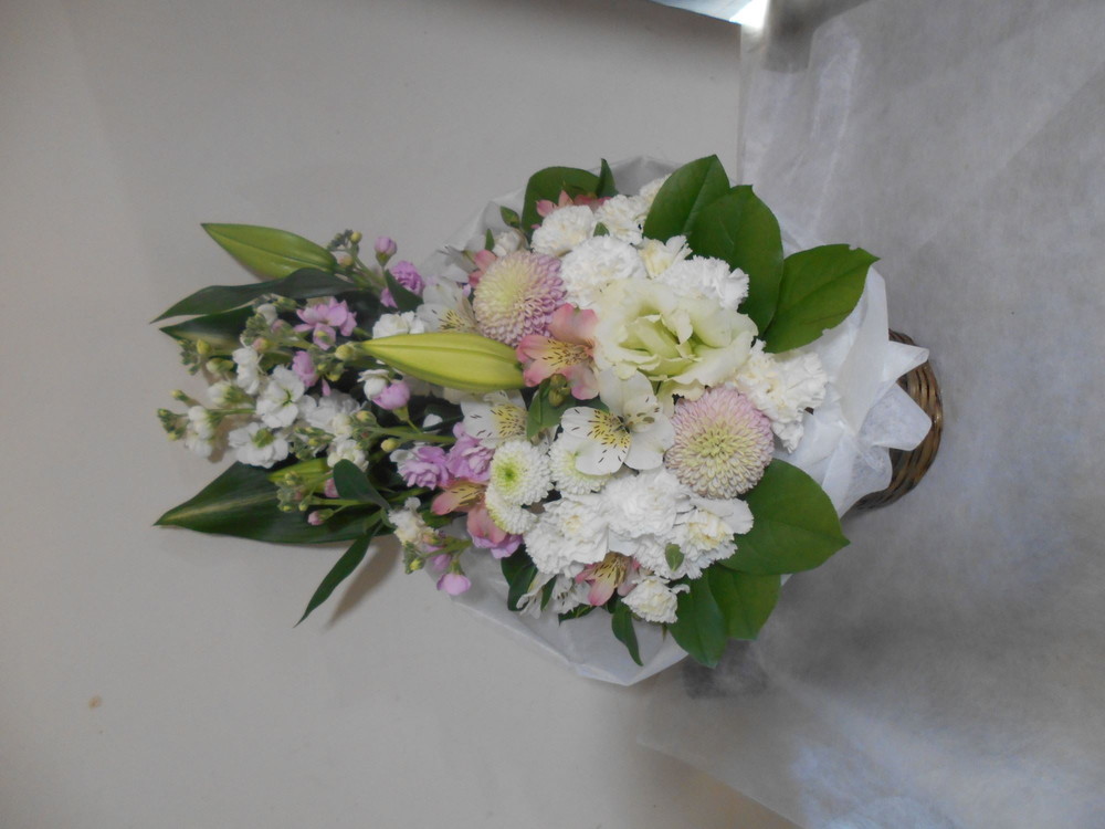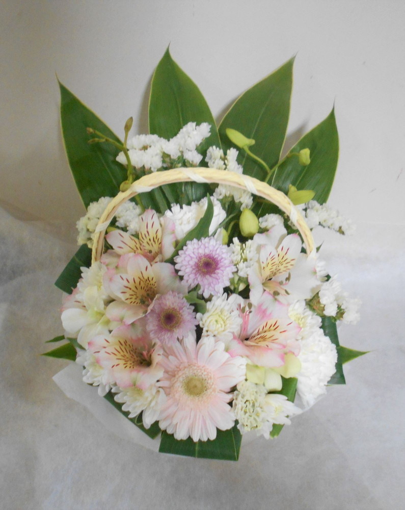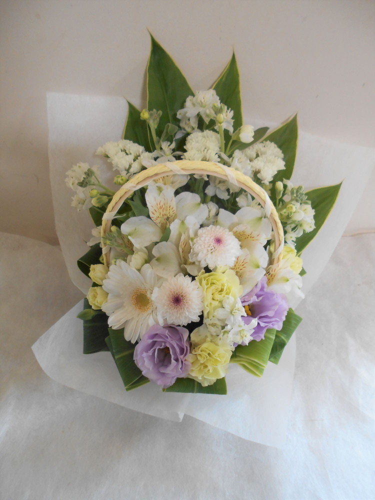 お悔やみ お供えの花 供花 (ホワイト&淡色カラーの手付きバスケットアレンジ)