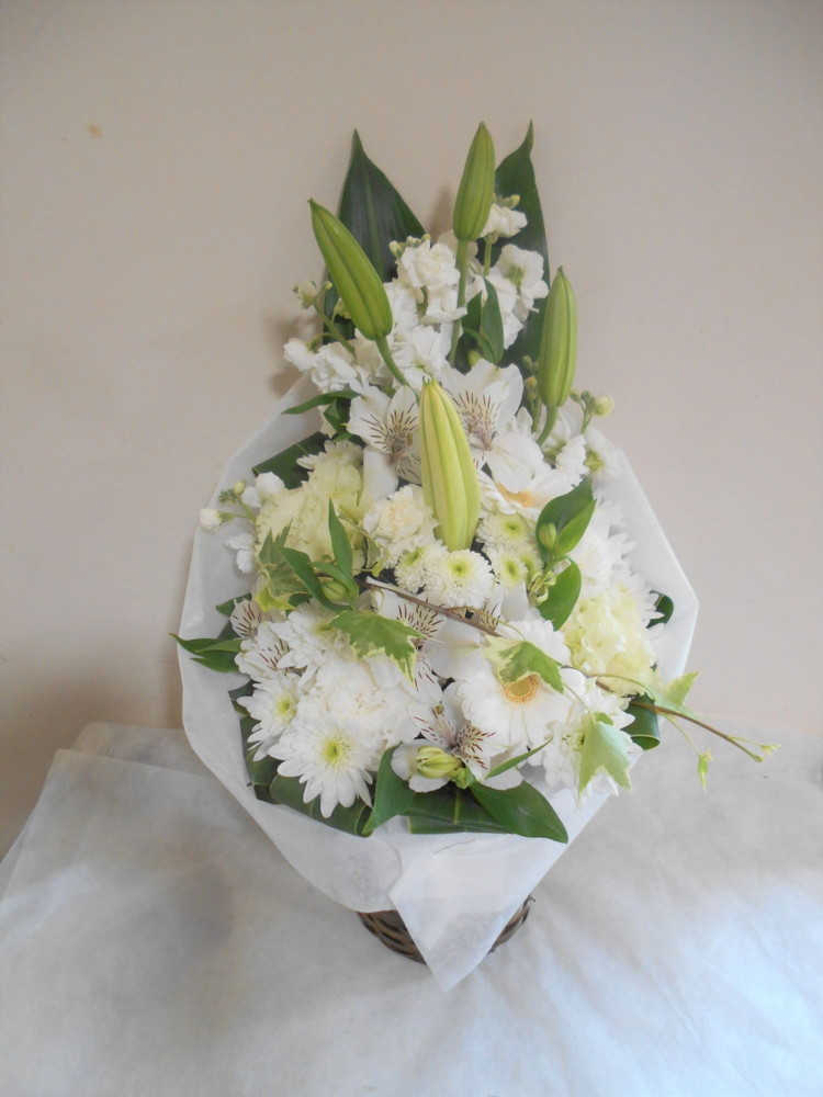 お悔やみ お供えの花 供花 (白ユリをメインにホワイト系でまとめたバスケットアレンジ)