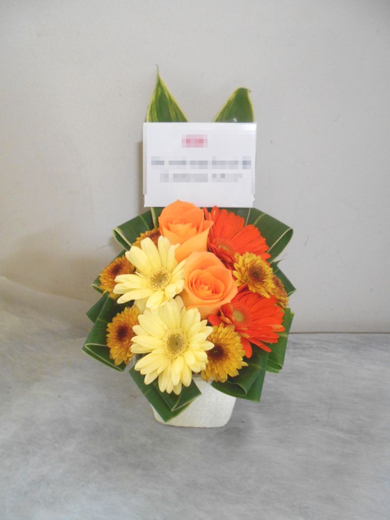 アレンジメントの実際にお届けした写真です。花秘書では発送前に写真をメールで送信致しますので安心して大切な顧客や取引様へのギフトにご利用頂けます。