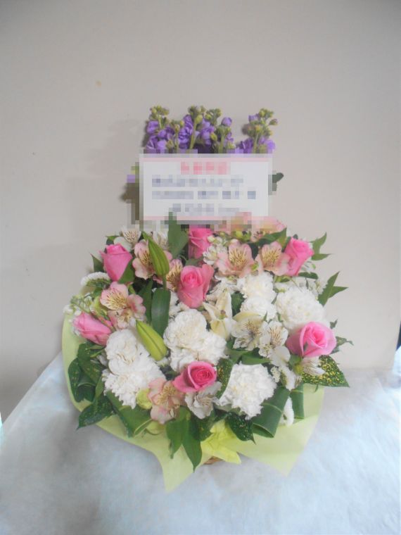 アレンジメントの実際にお届けした写真です。花秘書では発送前に写真をメールで送信致しますので安心して大切な顧客や取引様へのギフトにご利用頂けます。
