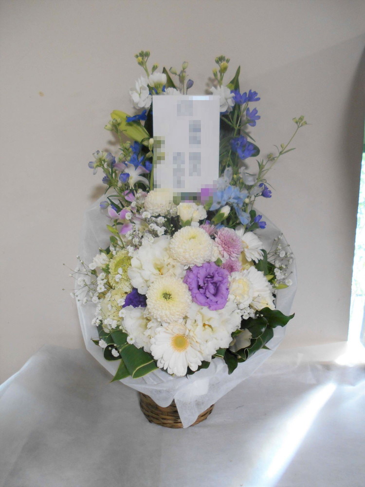 お悔やみ お供えの花 供花 (ホワイト&青・紫系カラーのお花でまとめたバスケットアレンジ)