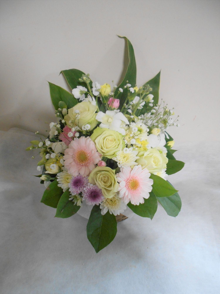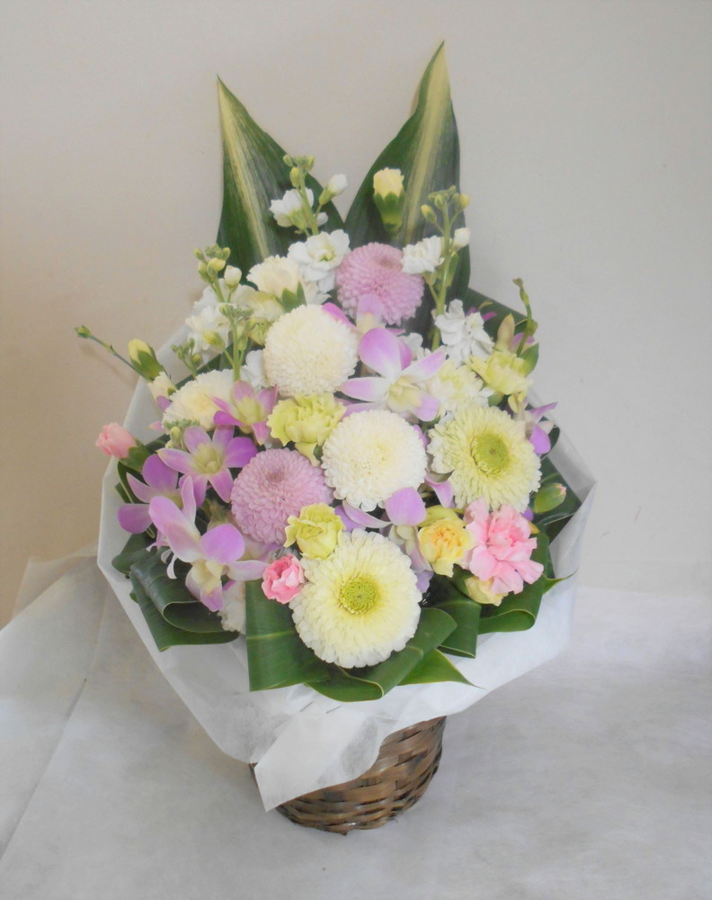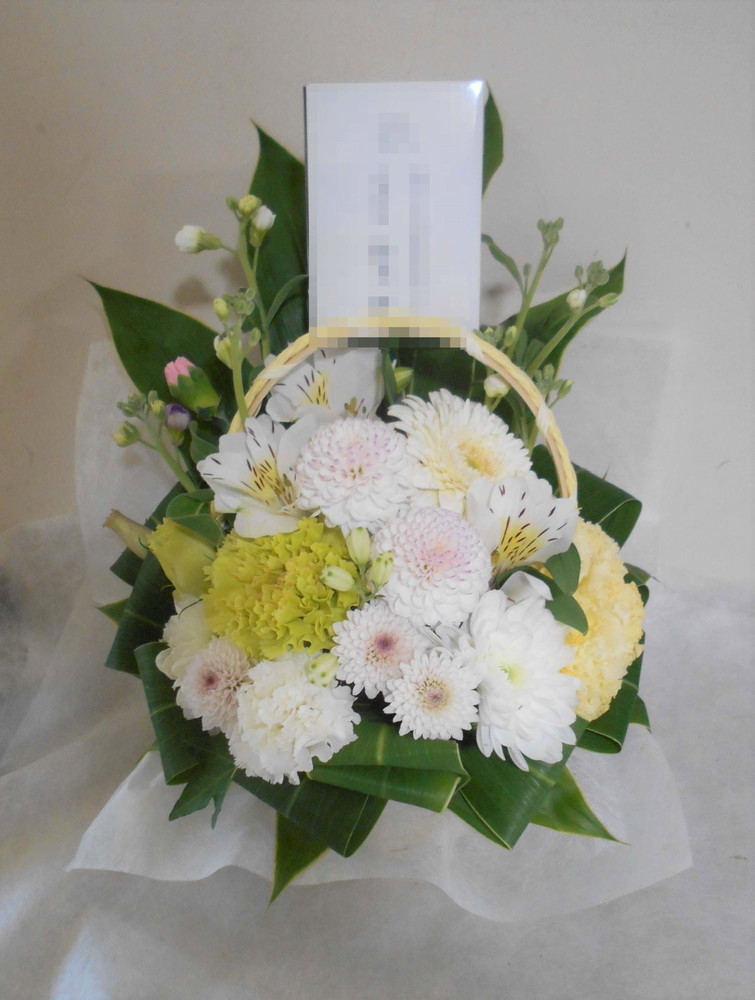 お悔やみ お供えの花 供花 (ホワイト&淡色カラーの手付きバスケットアレンジ)
