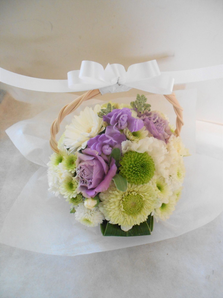 お悔やみ お供えの花 供花 (ホワイト&薄紫系でまとめた手付きのバスケットアレンジ)