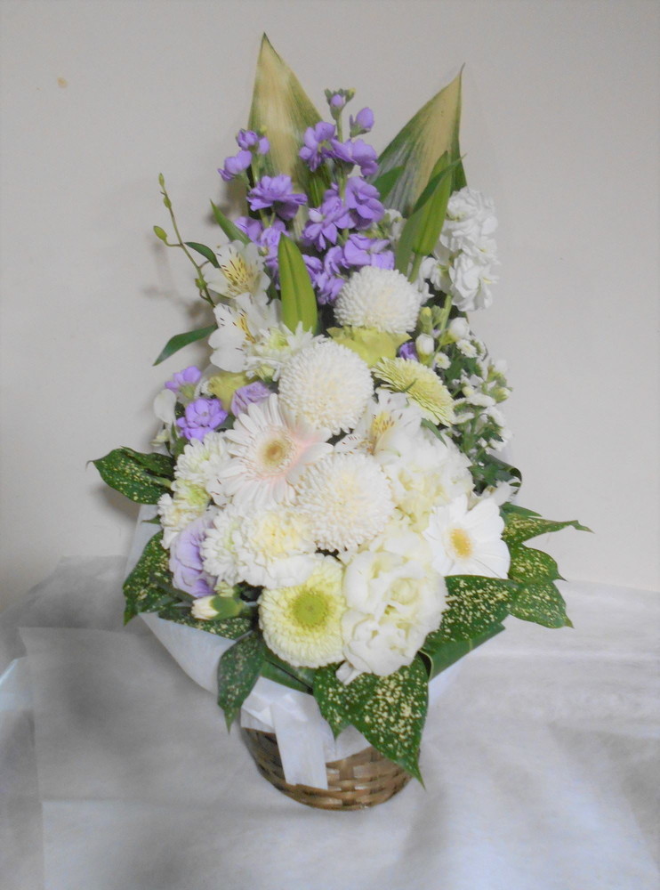 【白系】お悔やみ お供えの花 供花 (ホワイト&青・紫系カラーのお花でまとめたバスケットアレンジ)