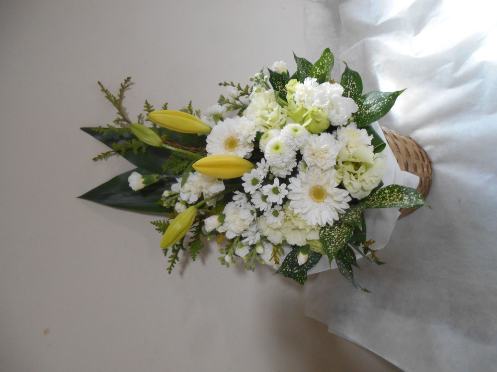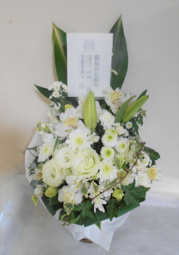 お悔やみ お供えの花 供花 (ホワイト&グリーンを基調にしたバスケットアレンジ)