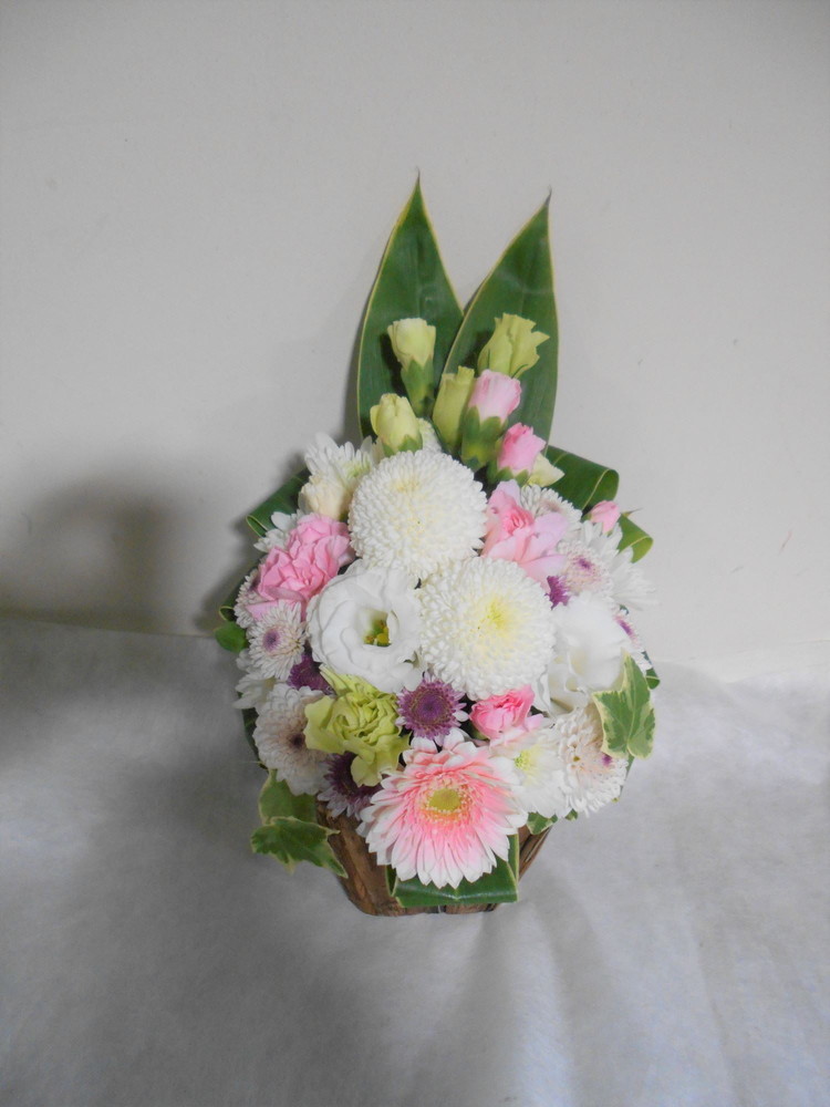 お悔やみ お供えの花 供花 (淡いピンク系のお花でまとめたバスケットアレンジ)