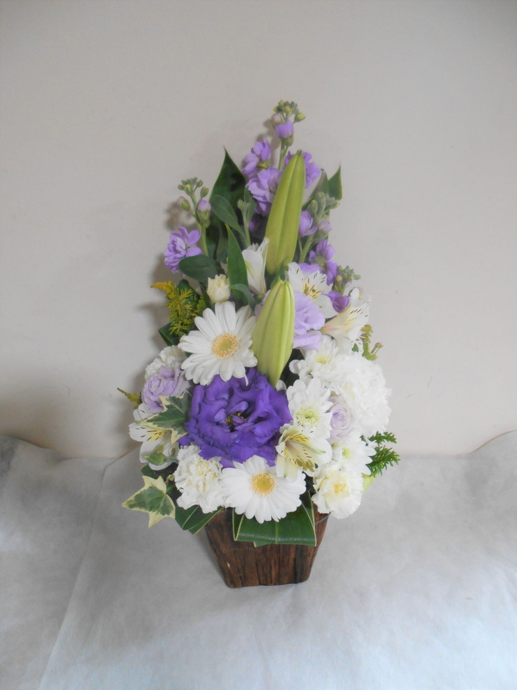 お悔やみ お供えの花 供花 (白基調でユリと紫系のお花をあしらったバスケットアレンジ)