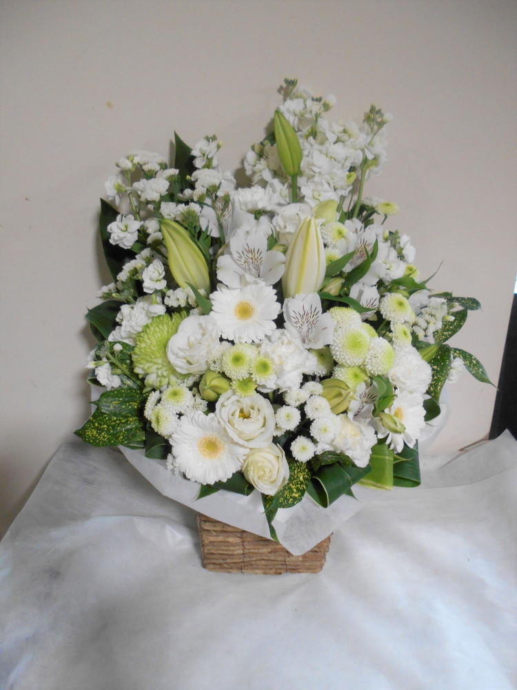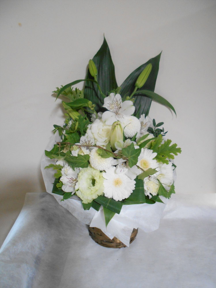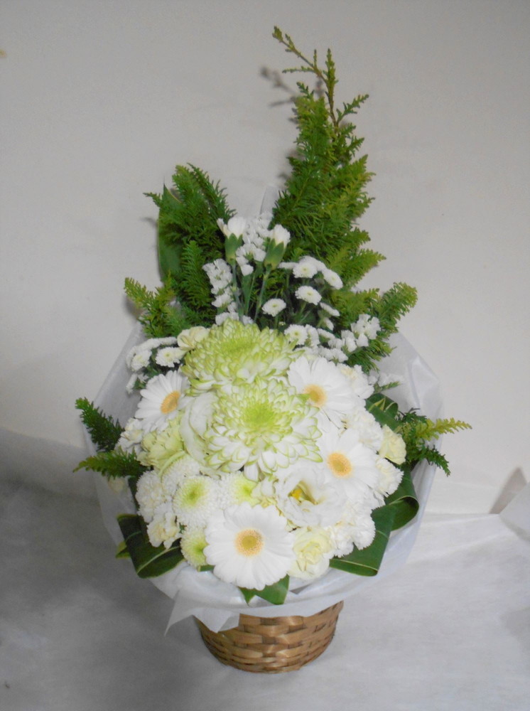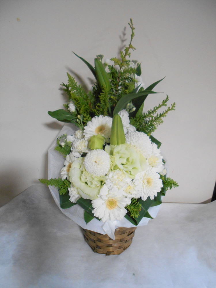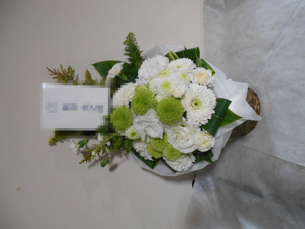 お悔やみ お供えの花 供花 (ホワイト&グリーンを基調にしたバスケットアレンジ)