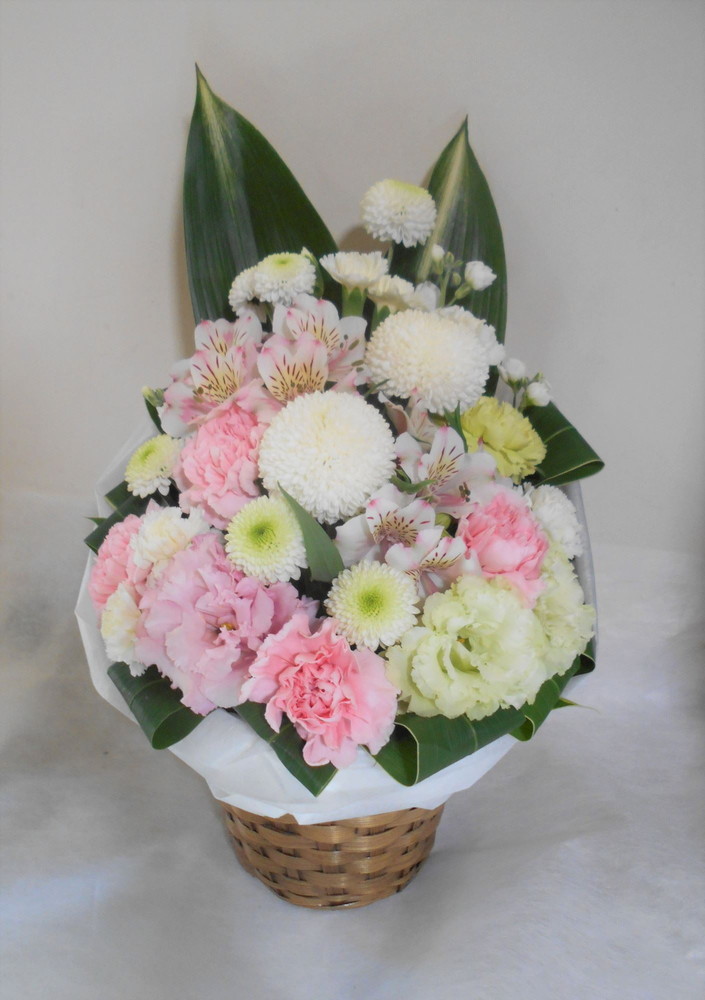 お悔やみ お供えの花 供花 (淡いピンク系のお花でまとめたバスケットアレンジ)