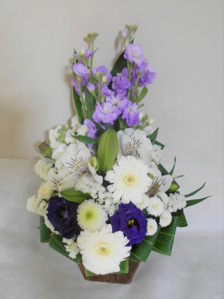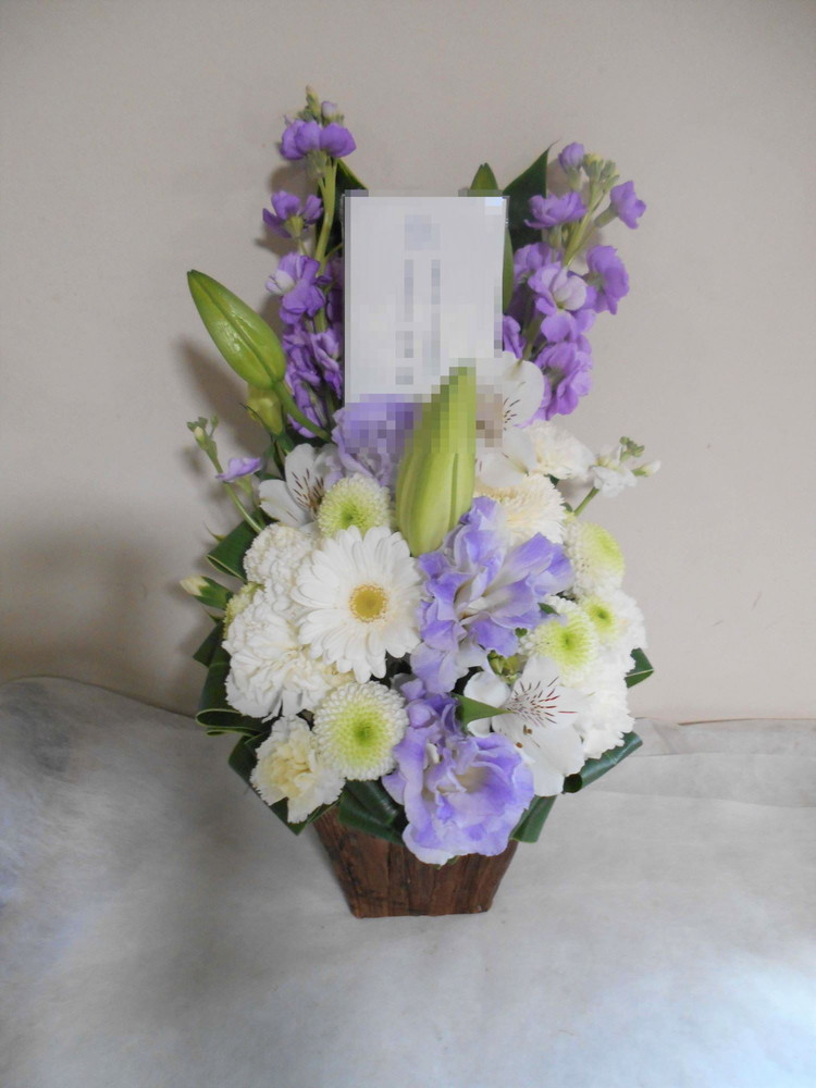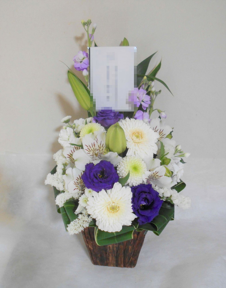お悔やみ お供えの花 供花 (白基調でユリと紫系のお花をあしらったバスケットアレンジ)