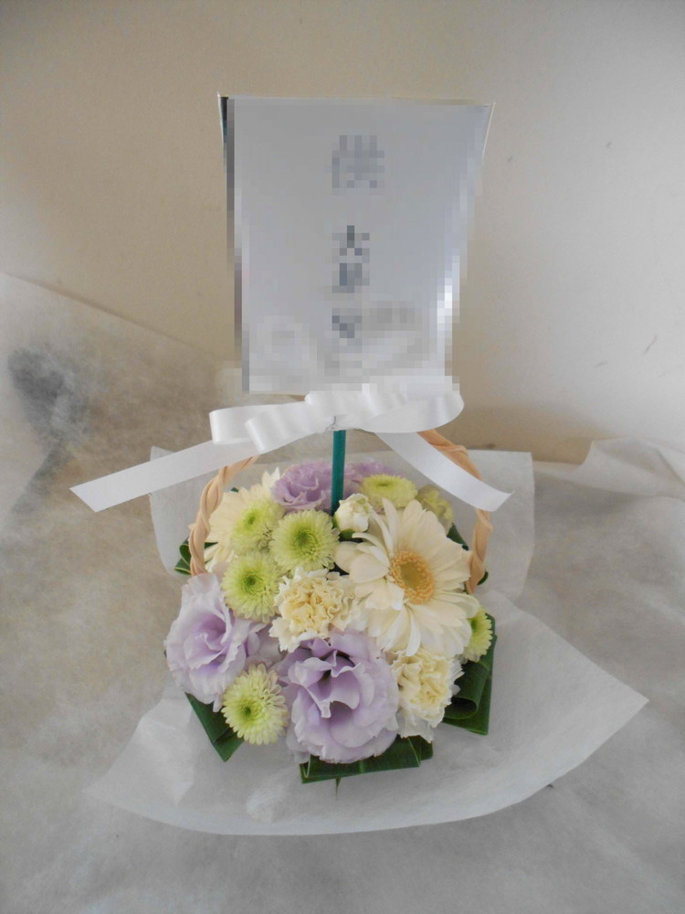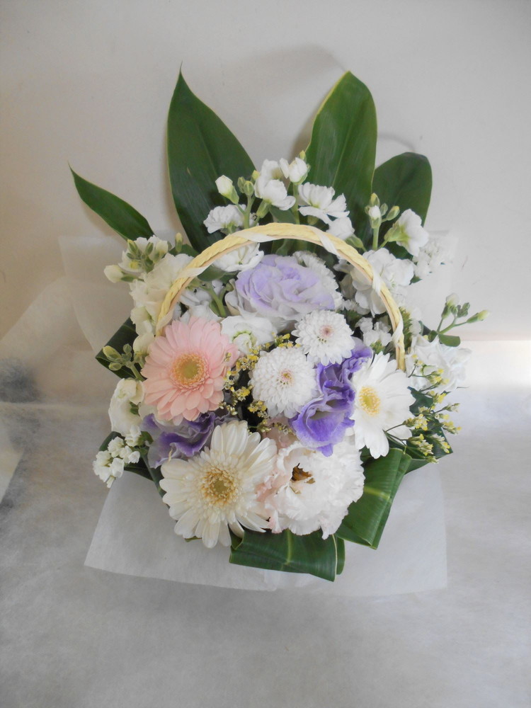 お悔やみ お供えの花 供花 (ホワイト&淡色カラーの手付きバスケットアレンジ)