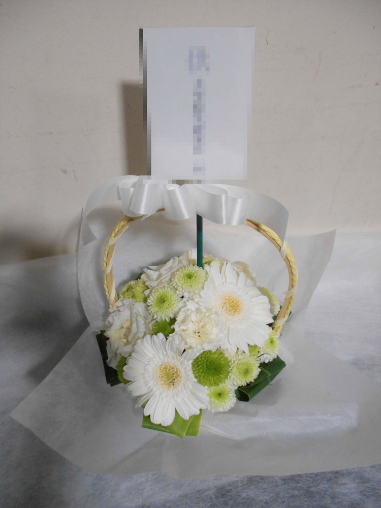 お悔やみ お供えの花 供花 (ホワイト&グリーンを基調にした手付きバスケットアレンジ)