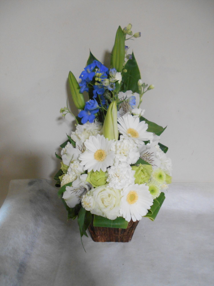 お悔やみ お供えの花 供花 (ホワイトにブルー系の挿し色を添えたバスケットアレンジ)