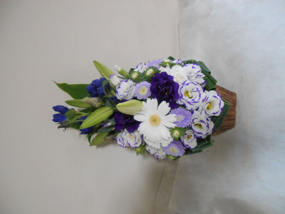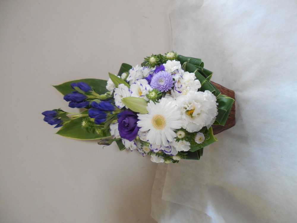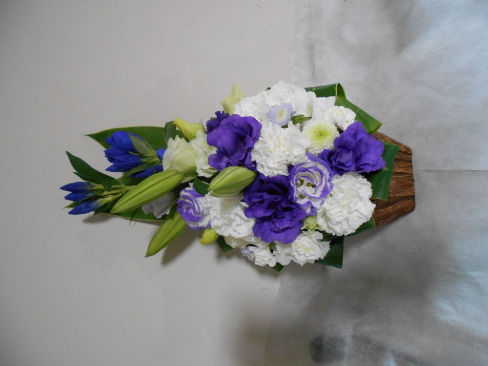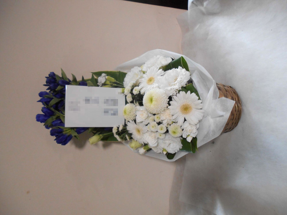 お悔やみ お供えの花 供花 (白基調に青系挿し色をそえたバスケットアレンジ)