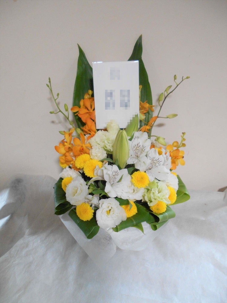 お悔やみ お供えの花 供花 (白ユリをメインに黄色の洋蘭をあしらったバスケットアレンジ)