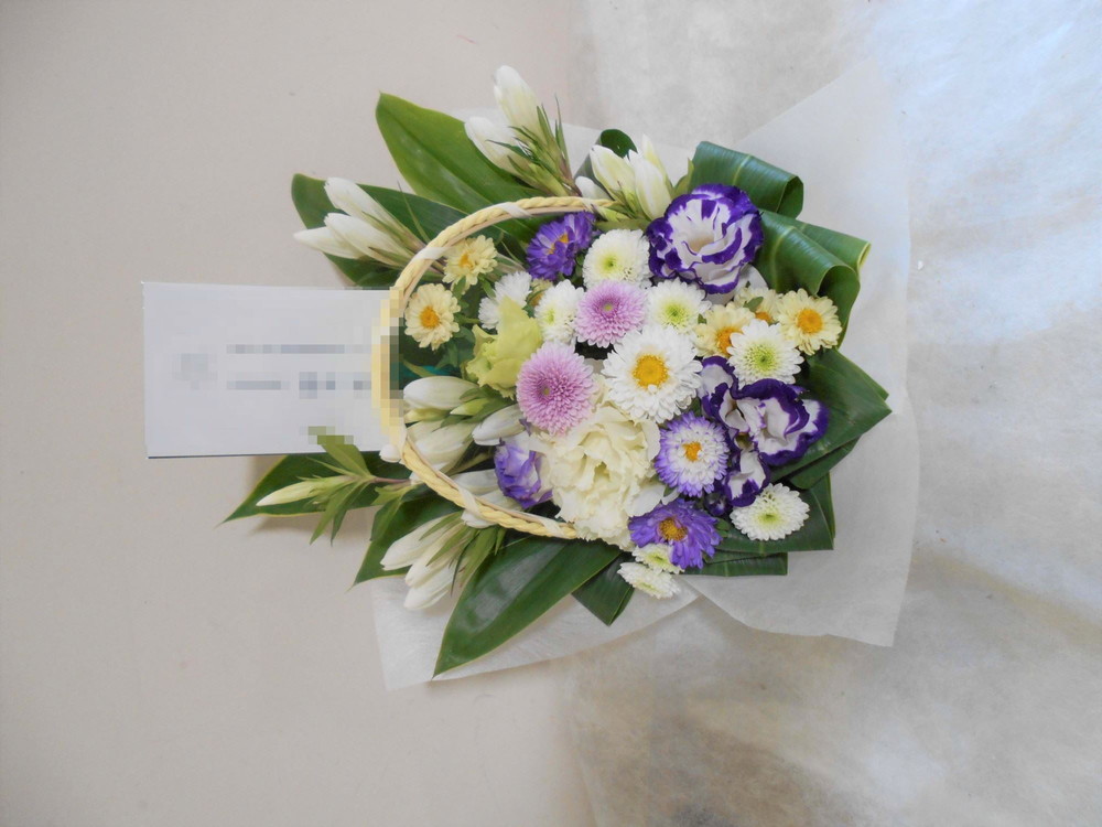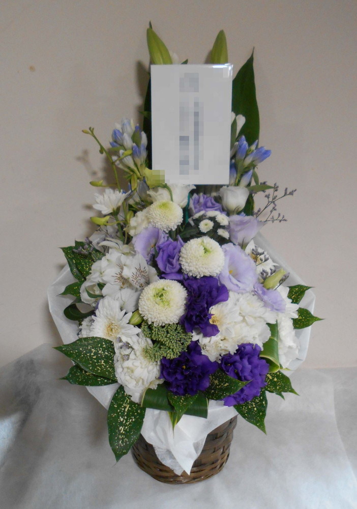 お悔やみ お供えの花 供花 (ホワイト&青・紫系カラーのお花でまとめたバスケットアレンジ)