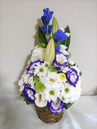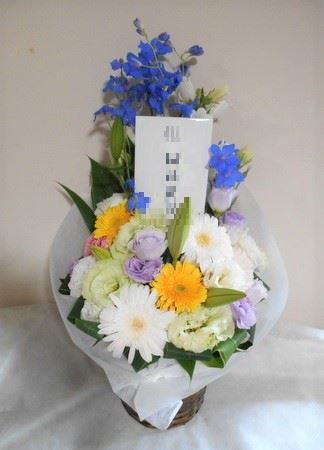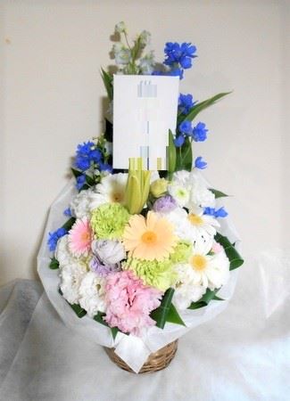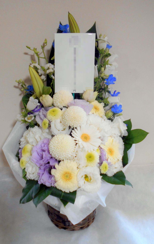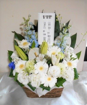 お悔やみ お供えの花 供花 (ホワイトにブルー系の挿し色を添えたバスケットアレンジ)