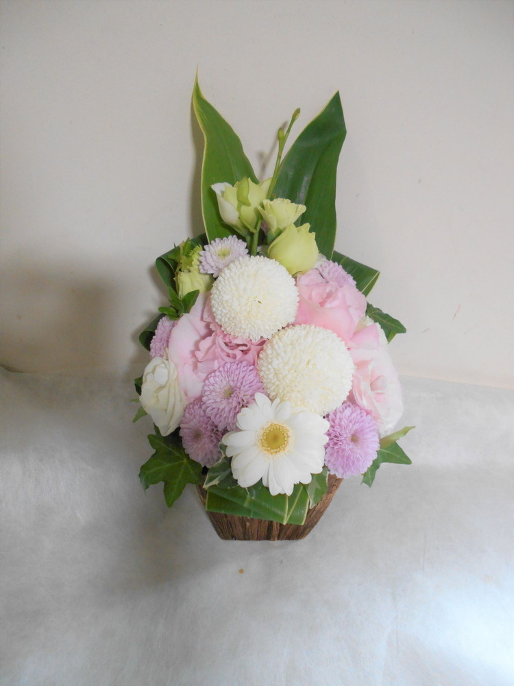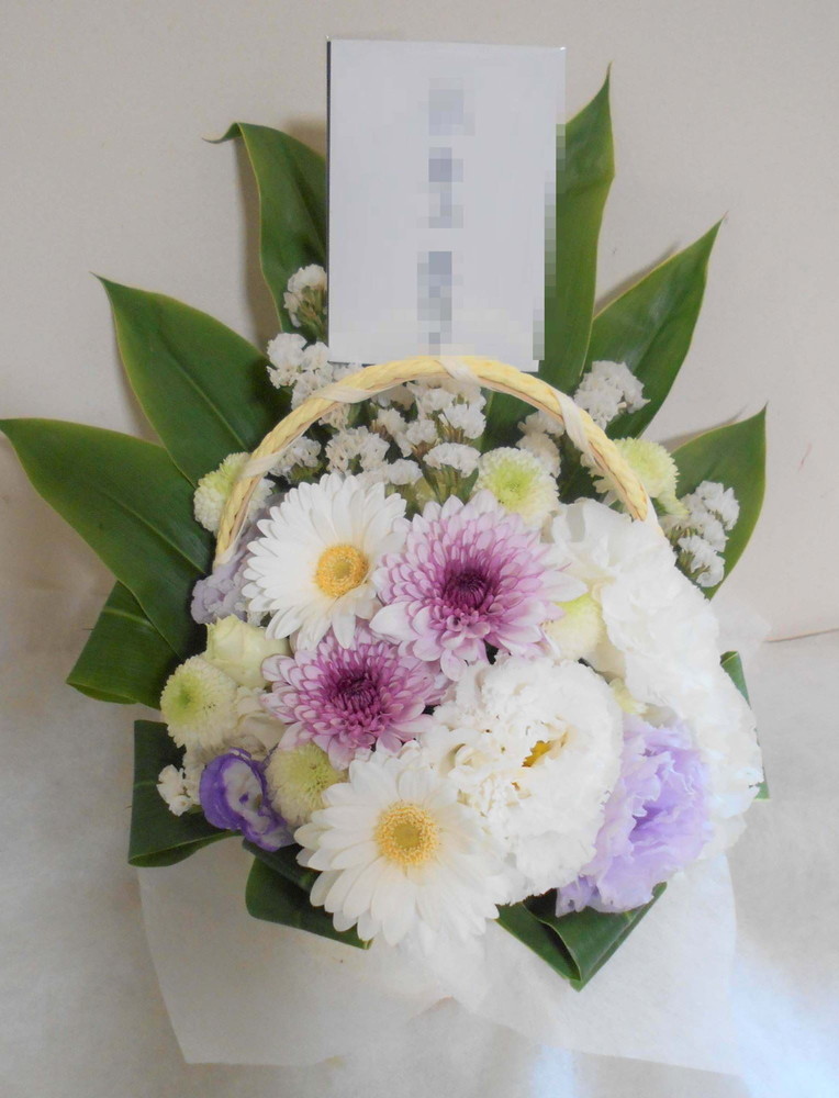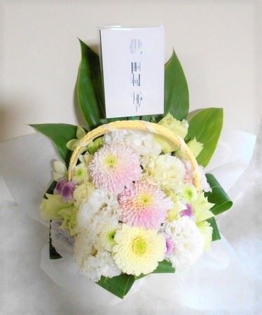 お悔やみ お供えの花 供花 (ホワイト&淡色カラーの手付きバスケットアレンジ)