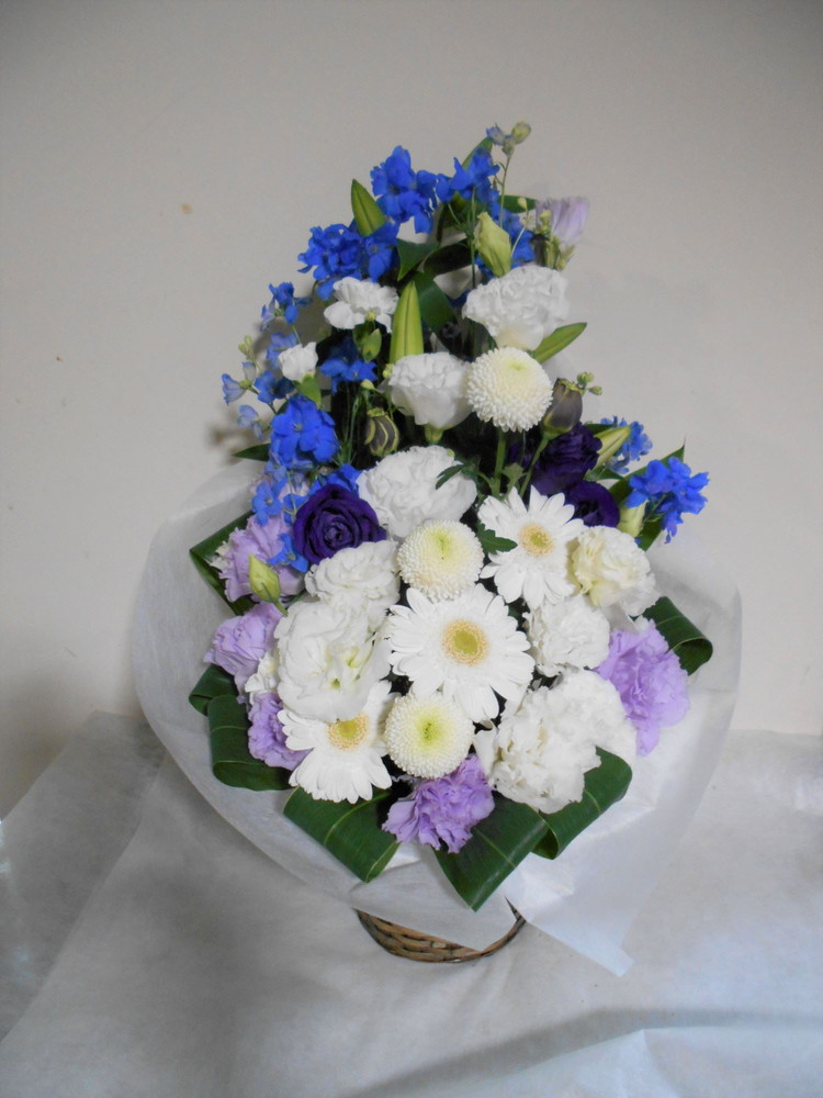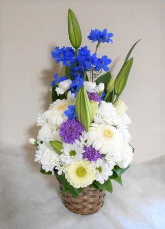 お悔やみ お供えの花 供花 (ホワイト&青・紫系カラーのお花でまとめたバスケットアレンジ)