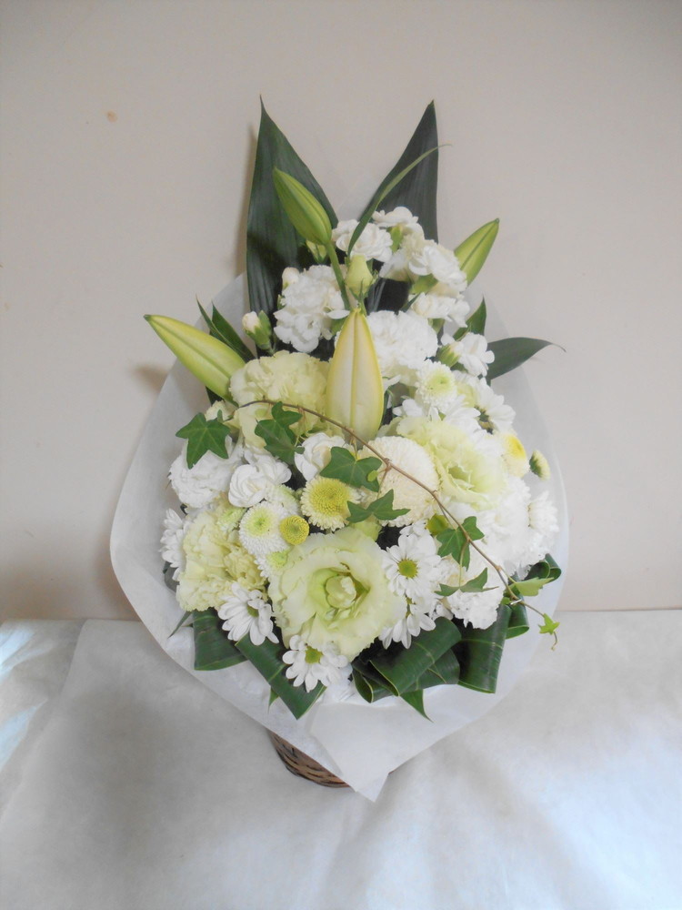 お悔やみ お供えの花 供花 (白ユリをメインにホワイト&グリーンでまとめたバスケットアレンジ)