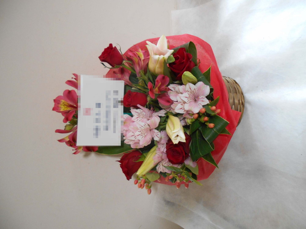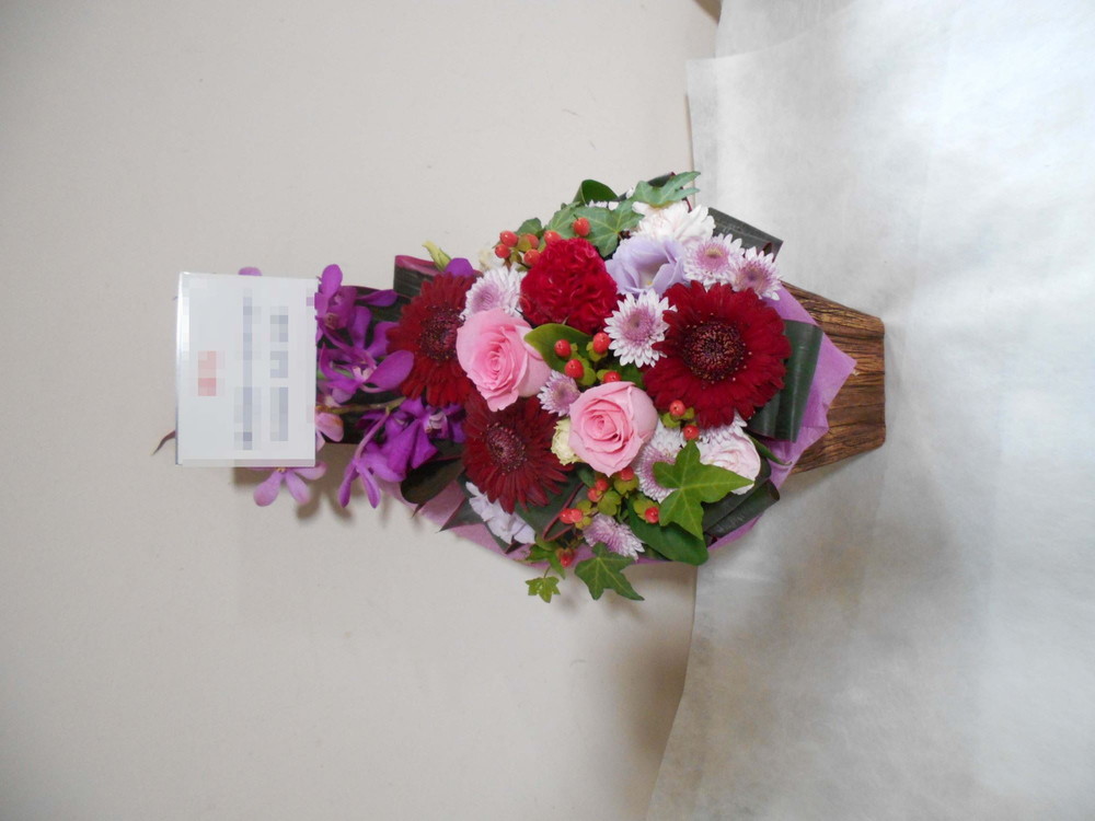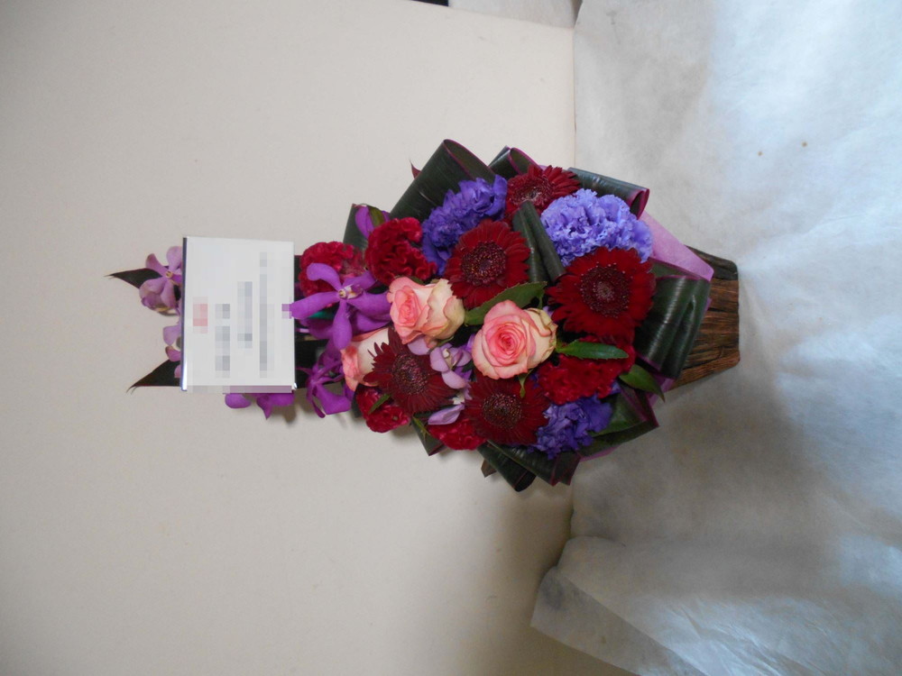 アレンジメントの実際にお届けした写真です。花秘書では発送前に写真をメールで送信致しますので安心して大切な顧客や取引様へのギフトにご利用頂けます。