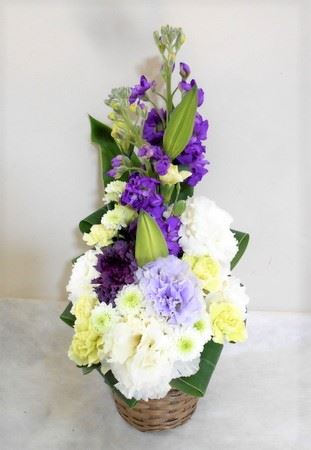 お悔やみ お供えの花 供花 (ホワイト&紫系でまとめたバスケットアレンジ)