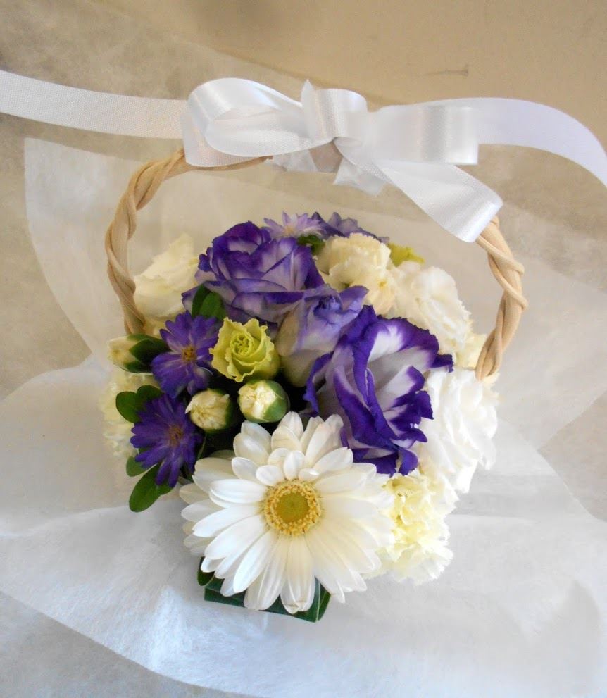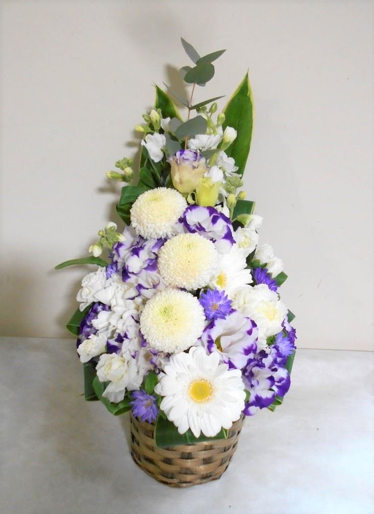 お悔やみ お供えの花 供花 (ホワイト&青・紫系カラーのお花でまとめたバスケットアレンジ)